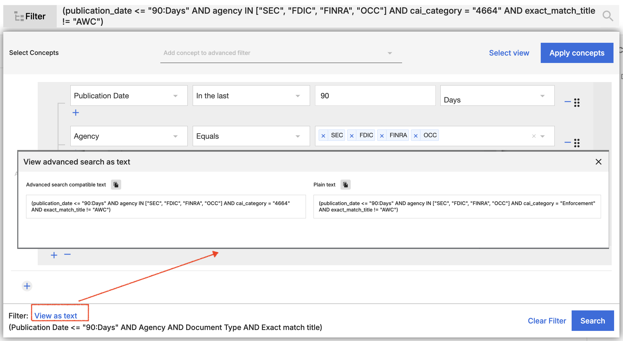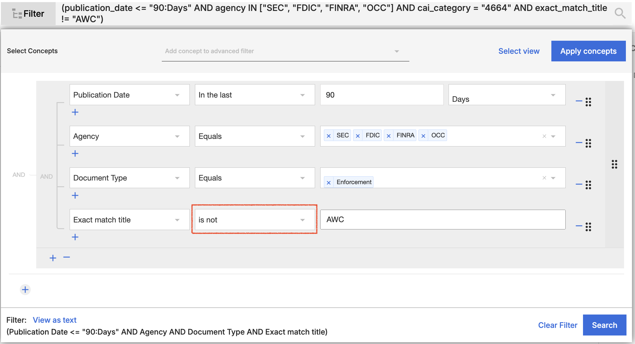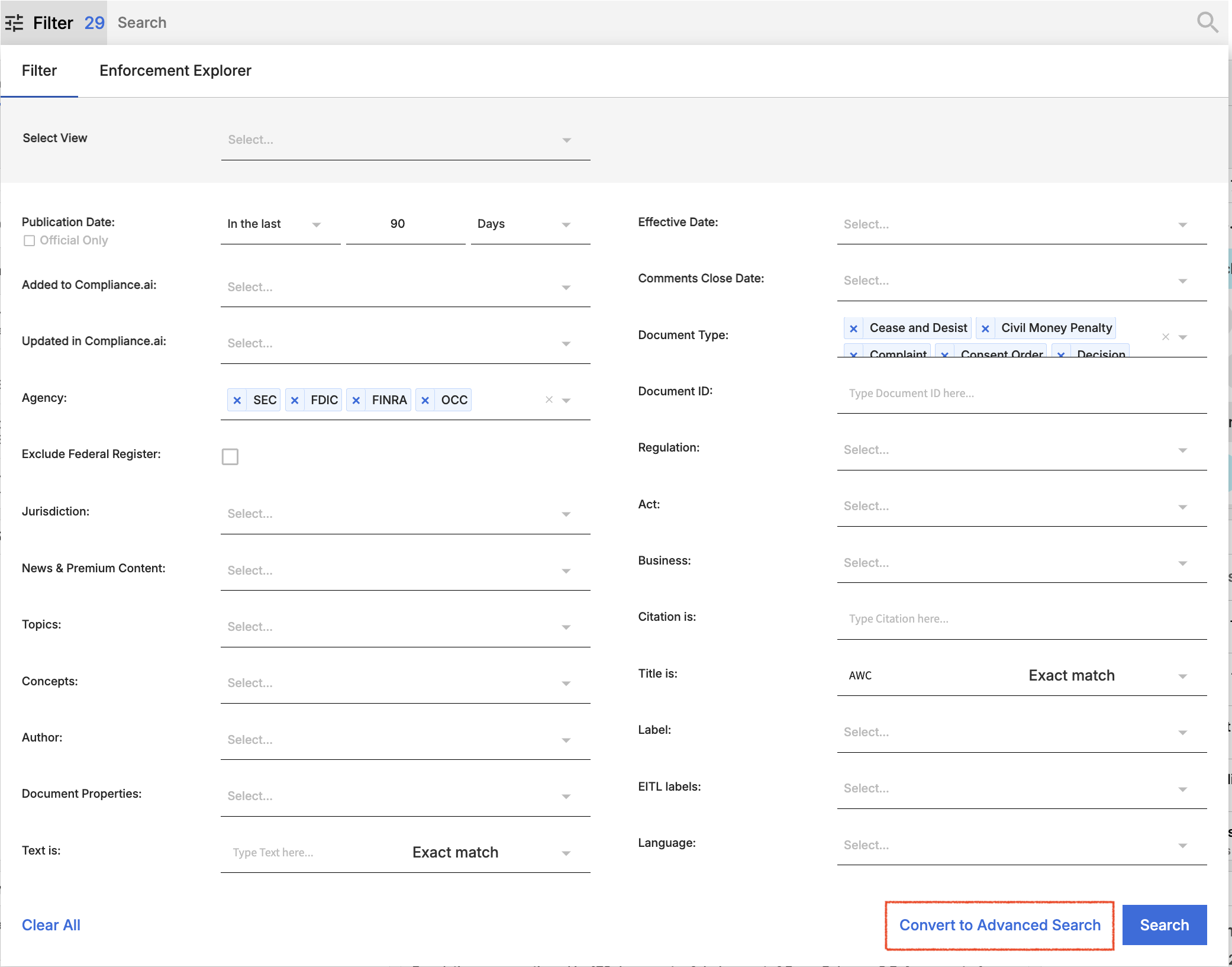 Using the “Convert to Advanced Search” feature is also a great way to leverage the simplicity of our Basic Filters, while also allowing you to take advantage of Advanced Search syntax. For example, if you wish to search for all enforcement documents published by the agencies you follow, but wish to exclude AWCs, add filters within the Basic Search filters, include title = AWC, then Convert to Advanced search so you can customize.