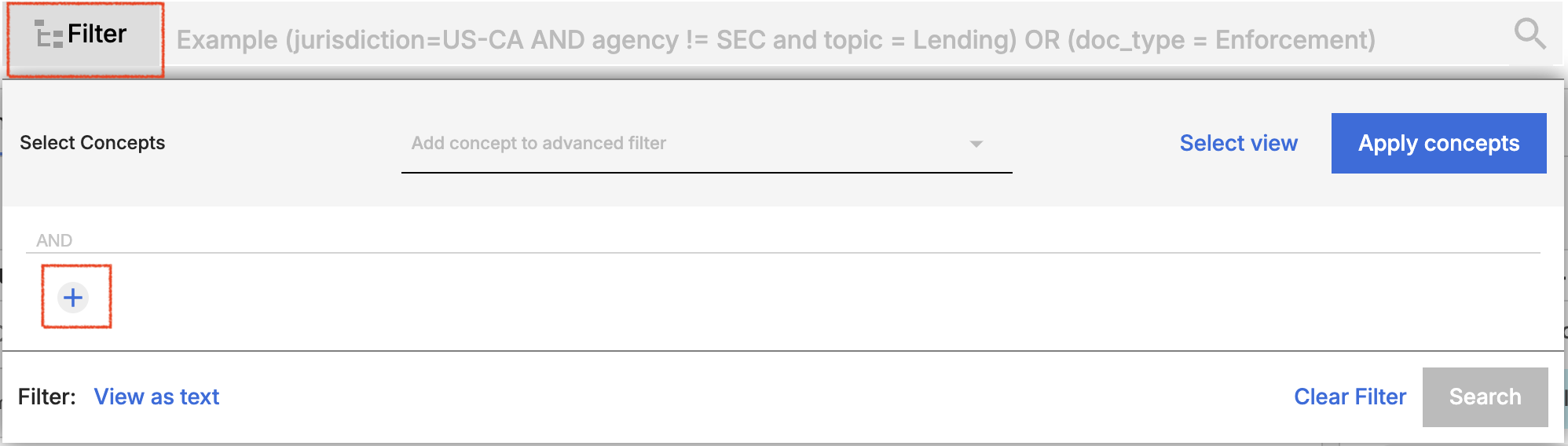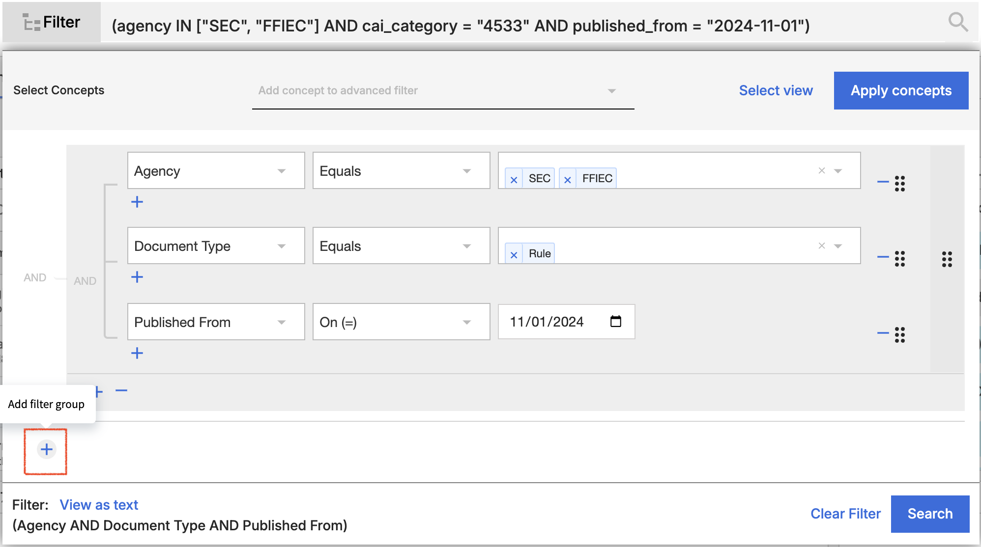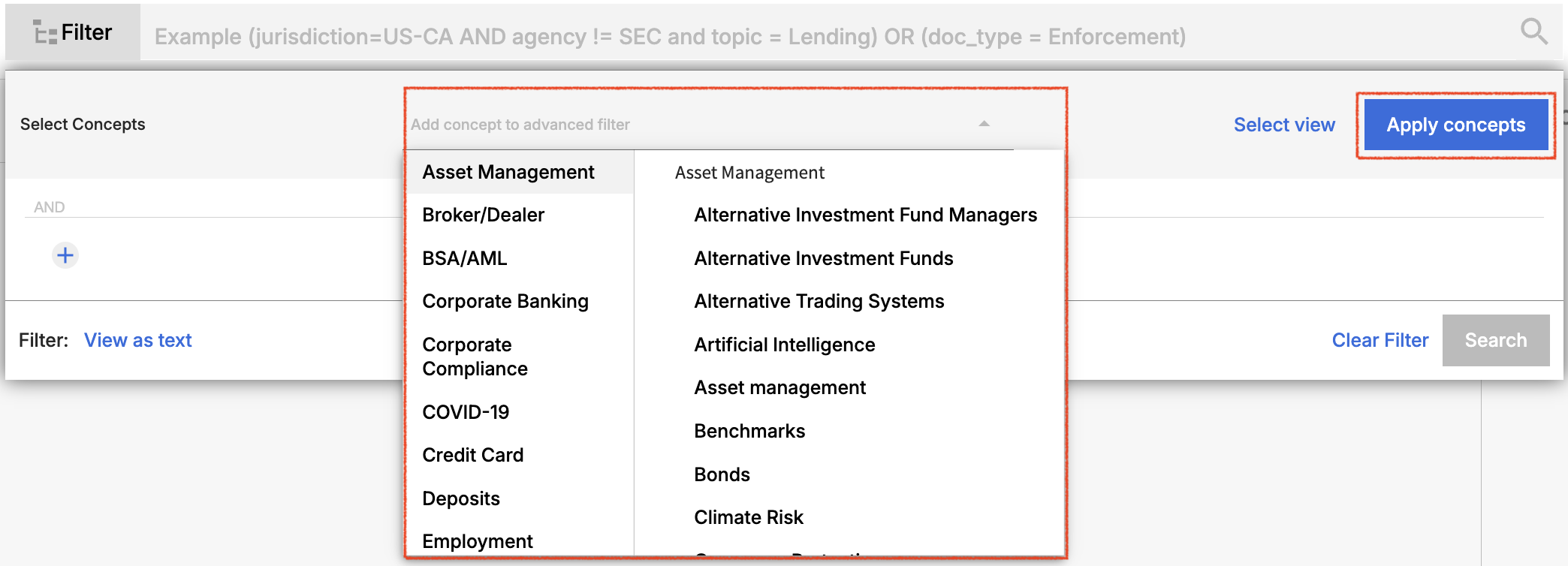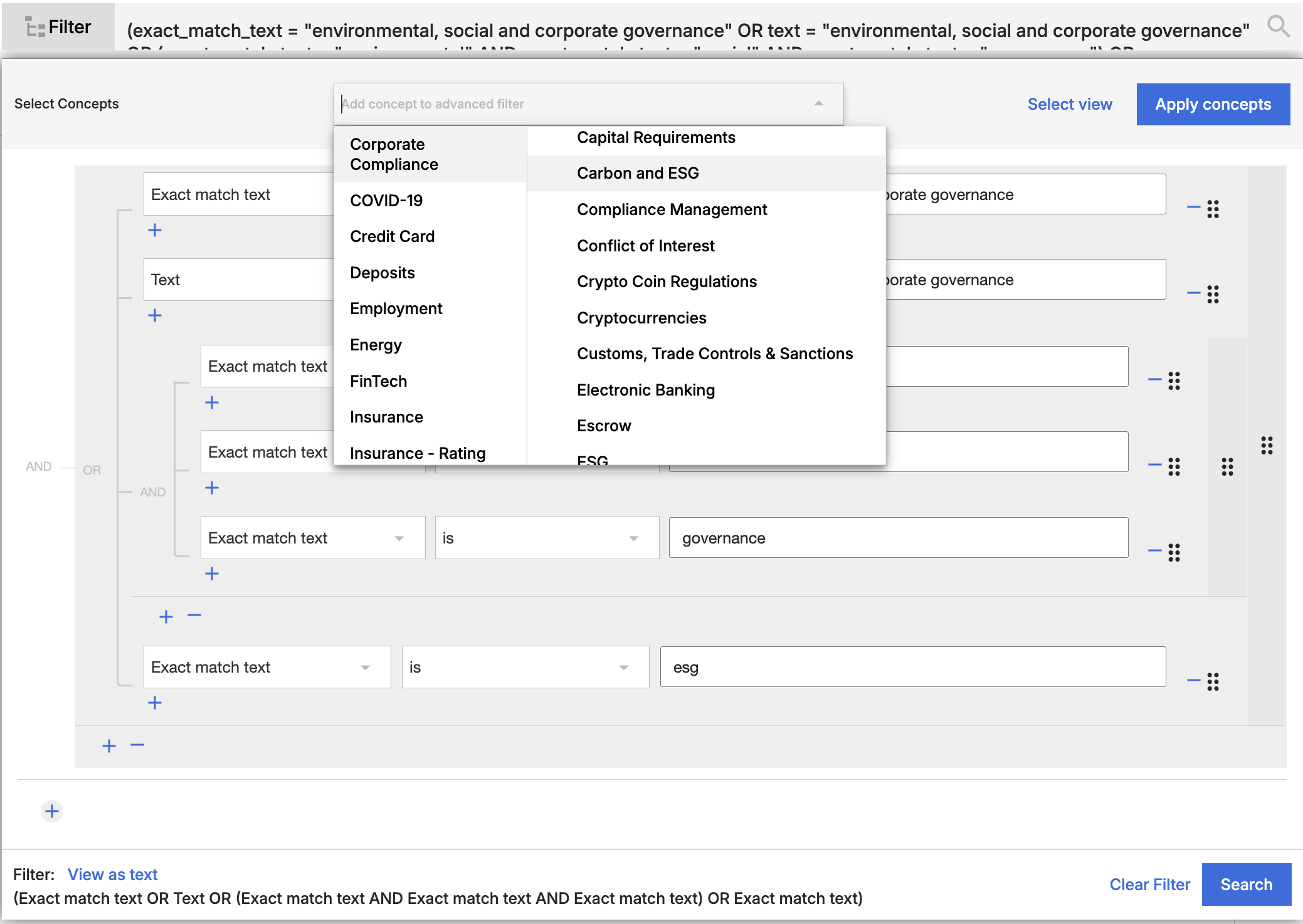You can add any Archer Evolv concept to an advanced search by selecting then concept, then using the “Apply concepts” button. Applying the concept within an advanced search will allow you to see exactly how the concept is constructed, add new elements to your search or remove items that are not relevant to your context.