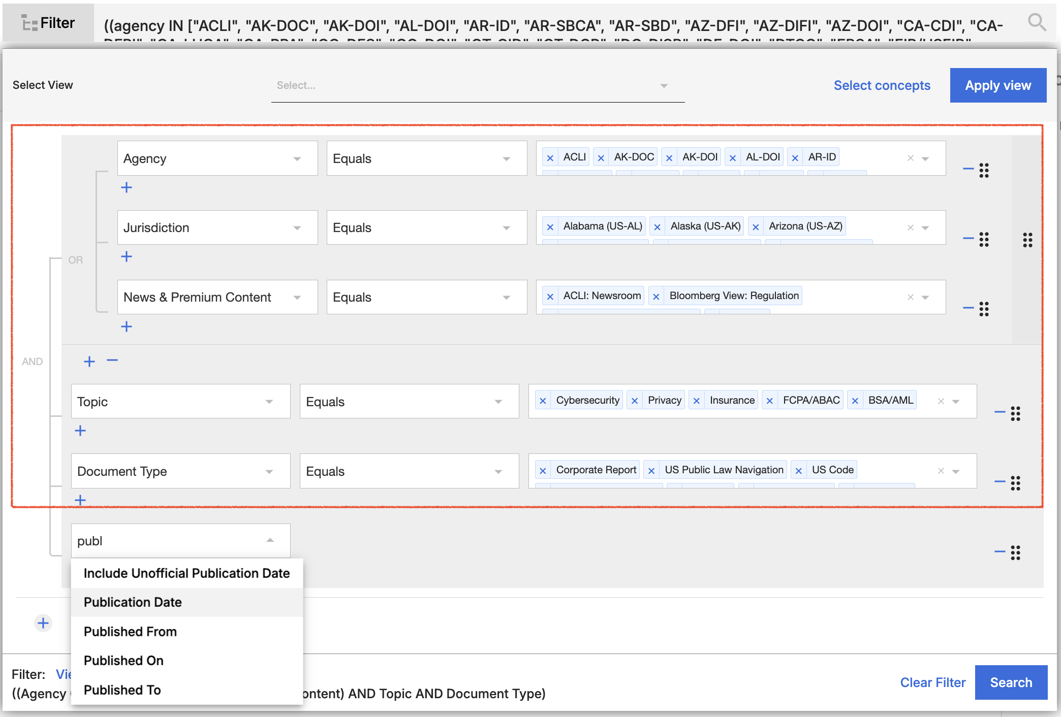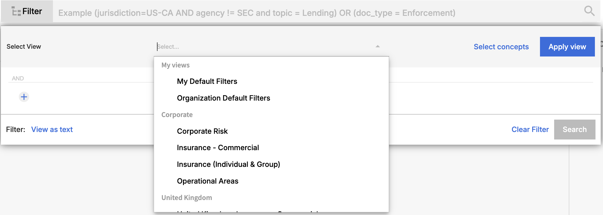 If you want to leverage team, organization, or your own personal default filters, including agencies, news & premium content sources, document types, topics and concepts, click the Select view link and then choose your preferred view.