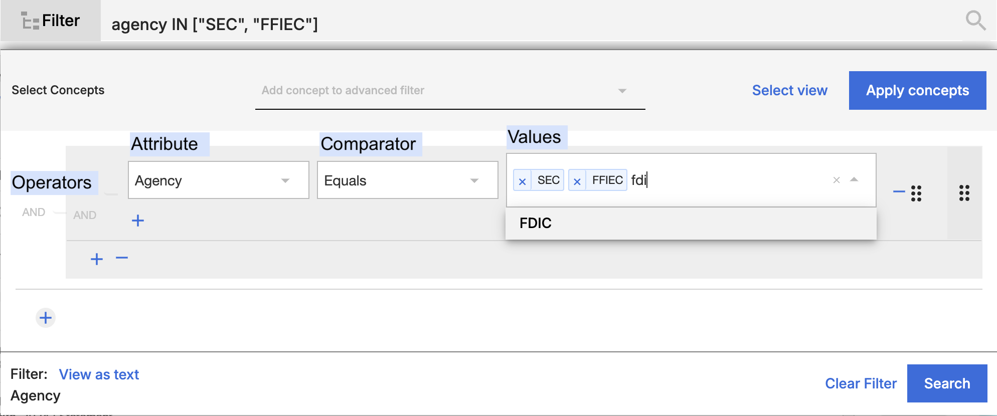 | agency | =(is) / !=(is not) | agency = “FDIC” | Click here |
