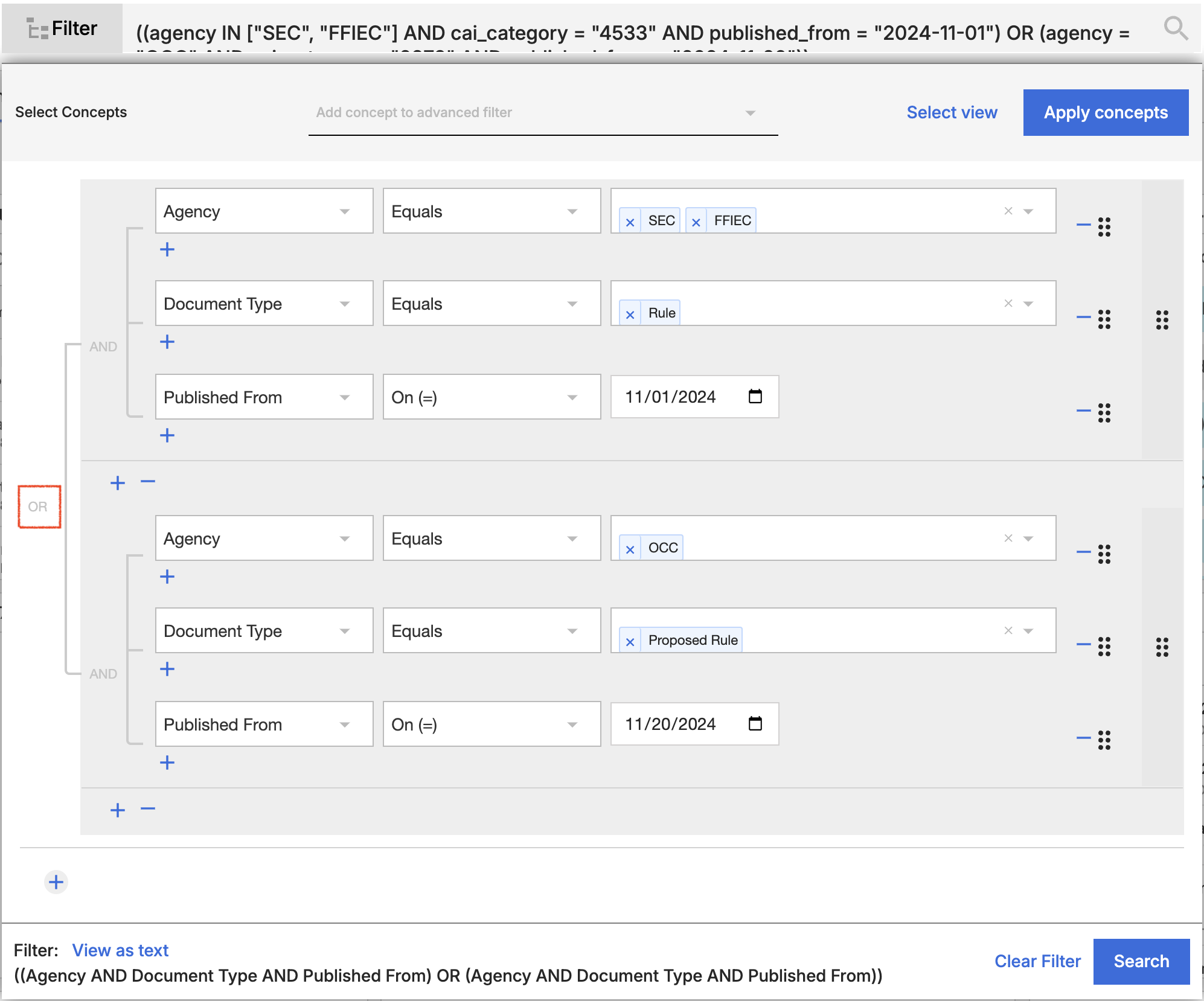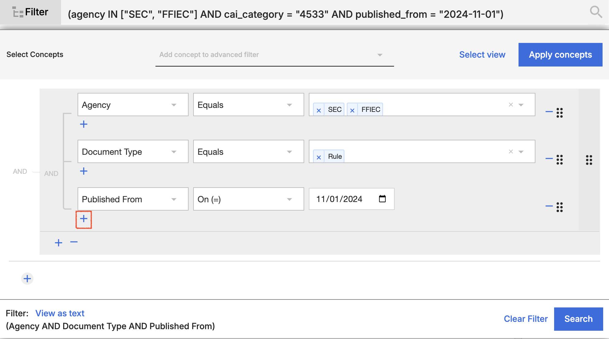- You can add Boolean search terms such as “and/and not,” “or/or not,” in between any of the filter types