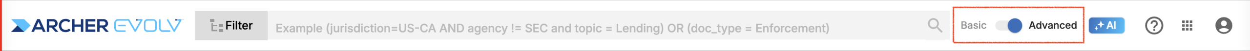 Archer Evolv’s Advanced Search feature allows you to further filter content with an exclude option. Use the toggle next to the Search bar to switch to Advanced Search at any time.