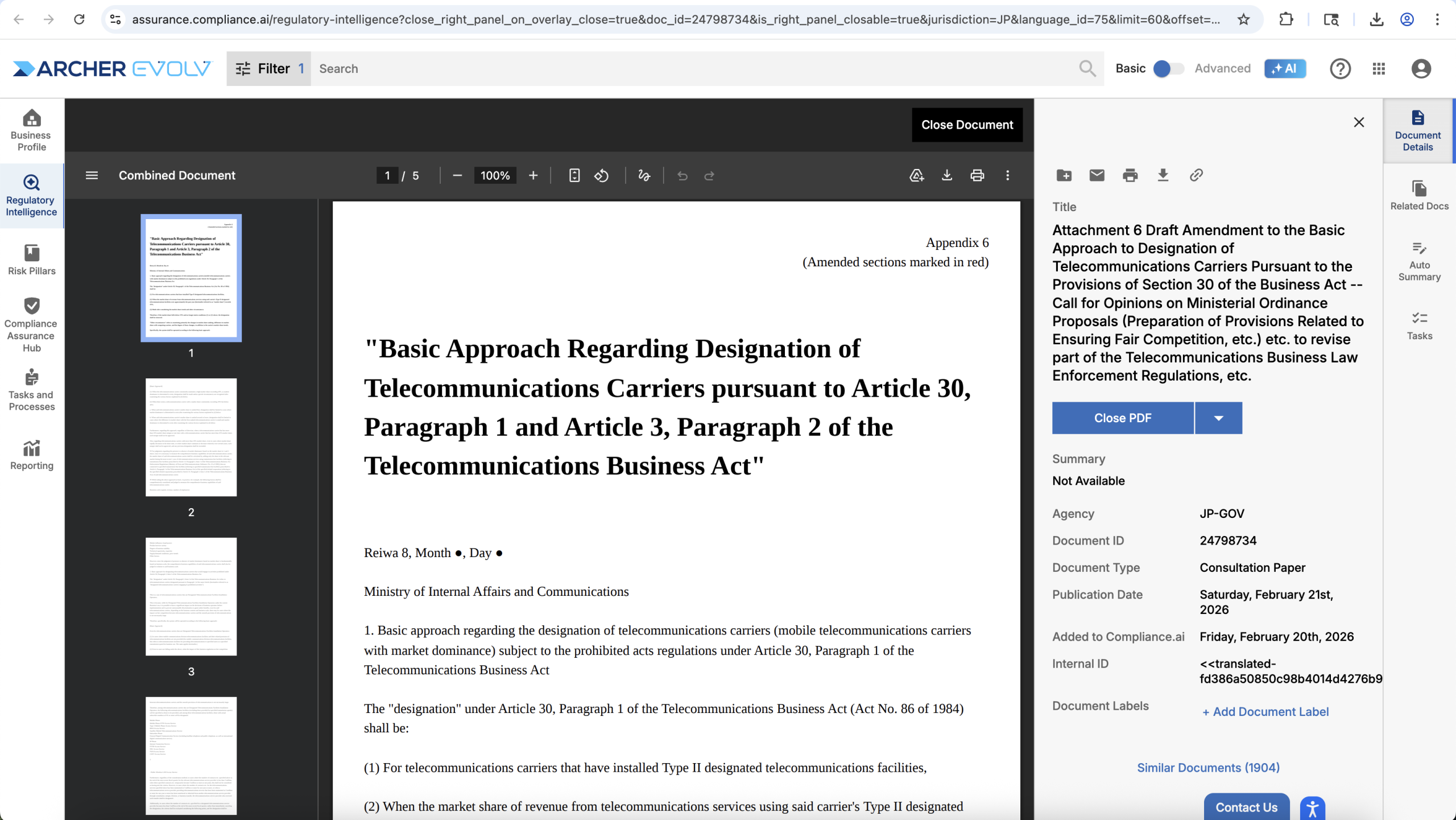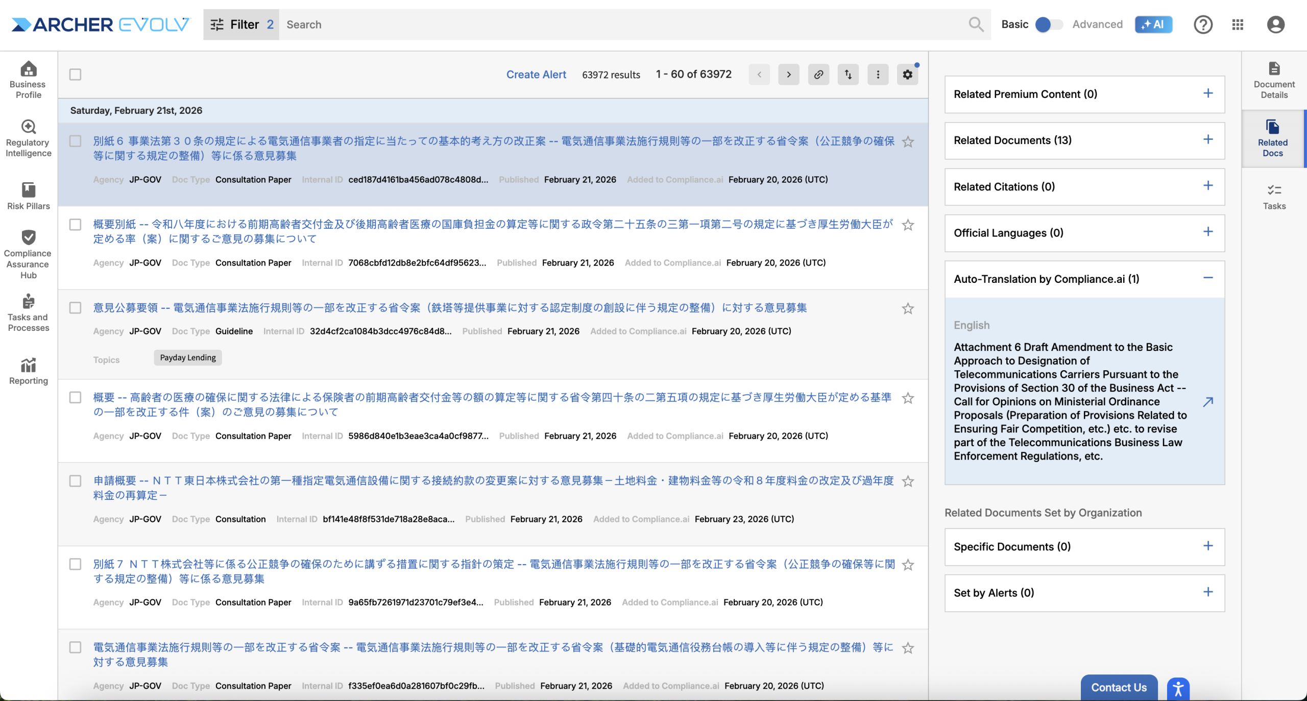 Auto-Translation provides access to English translations of regulatory documents that do not have an official English version. Clients with access to auto-translation not only have access to a PDF of the English version, but also, if the document is sentencified, they can leverage Archer Evolv’s annotations and obligations capabilities.
