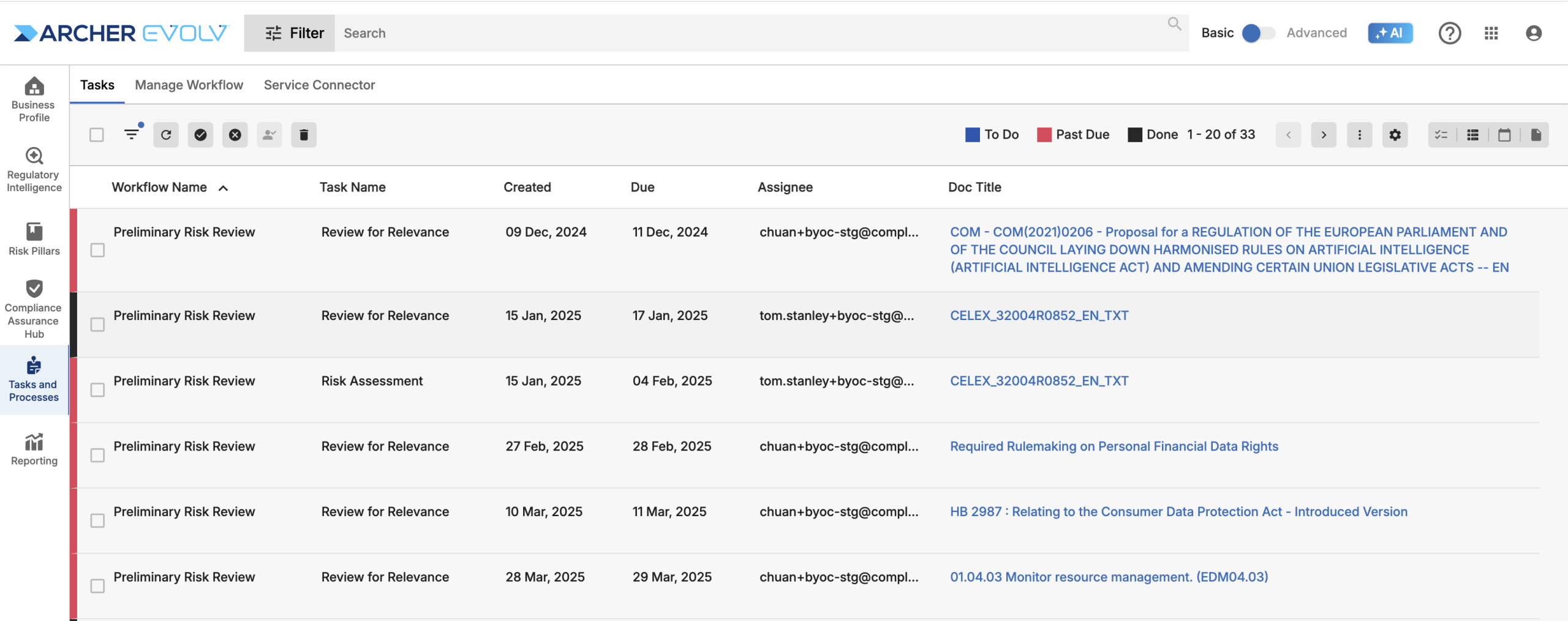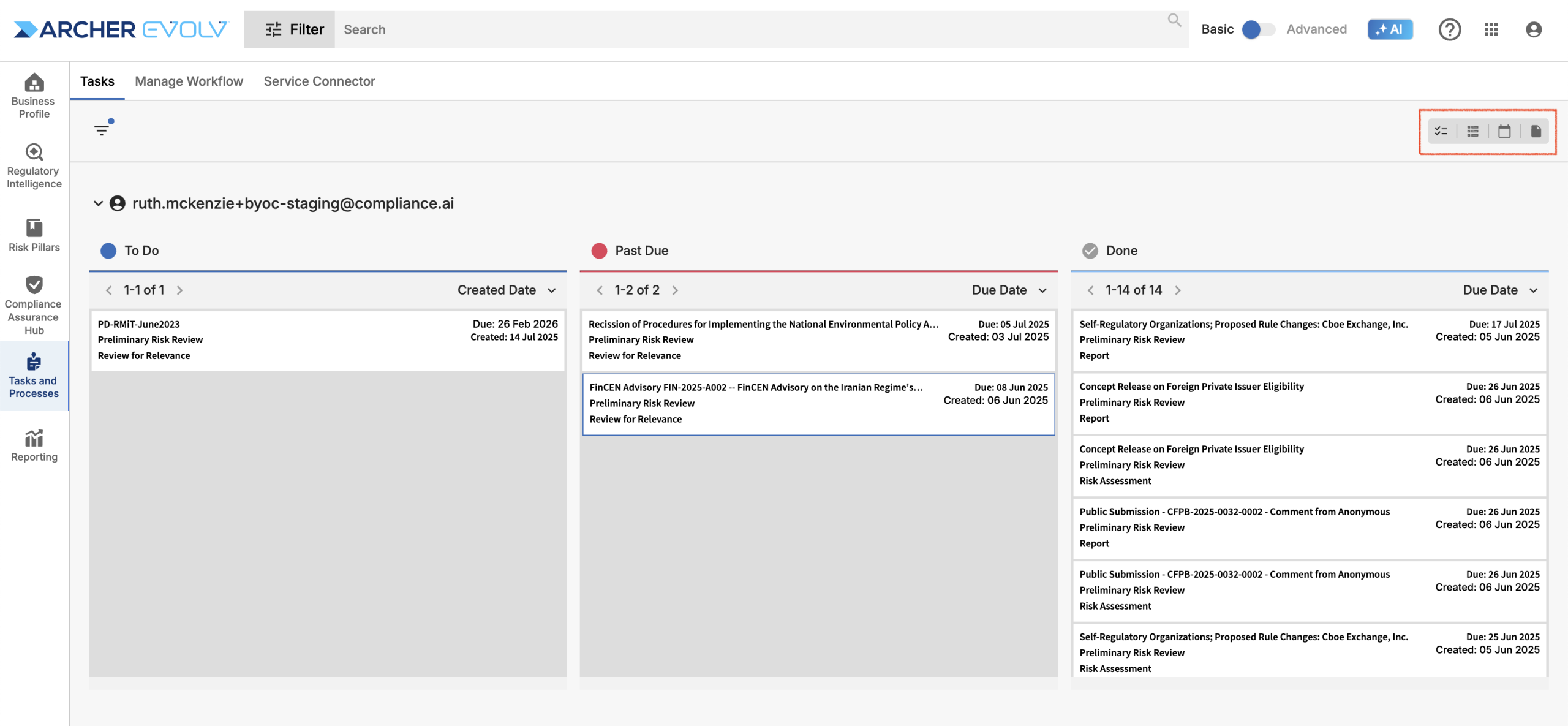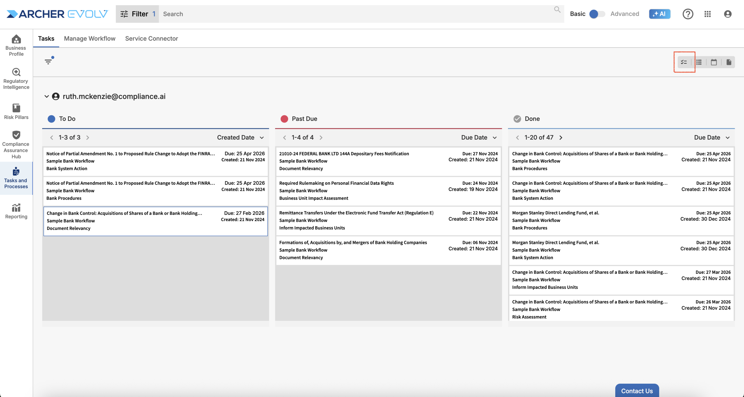 The tasks screen allows you to access workflow information through four different views depending on your needs. The kanban view, shown above, provides detailed information on a task level in an easy-to-follow grid format, highlighting To Do and Past Due tasks assigned to specific users. The view defaults to your user ID, but admins can also choose to view tasks assigned to others in the organization.