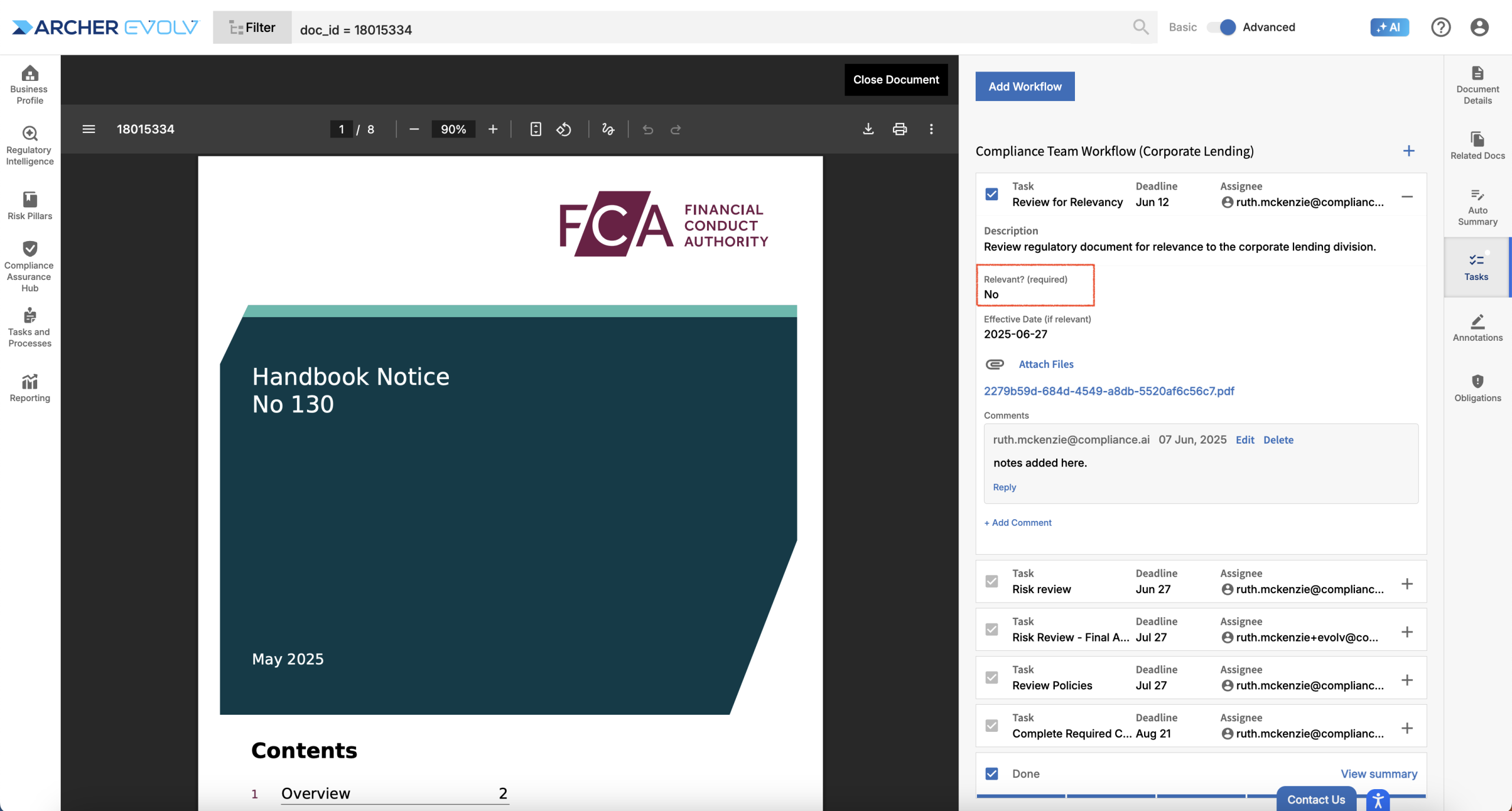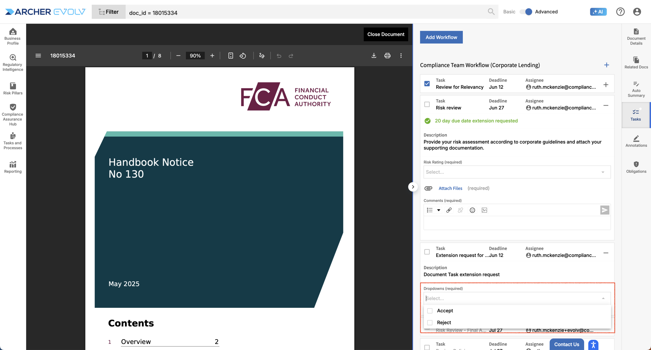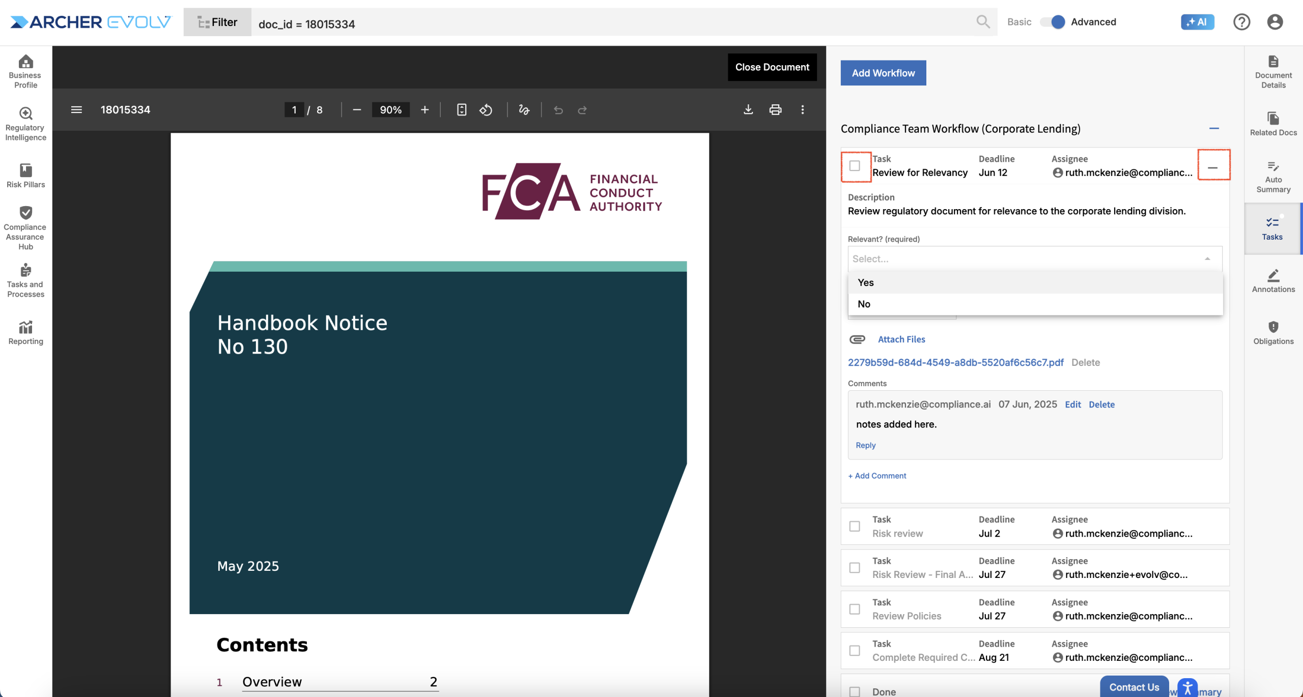 Be aware that your dropdown selection can impact following steps in the workflow depending on how the workflow is configured. For example, in this case, if you indicate that this document is not relevant, the subsequent tasks are auto-completed. If you make a mistake and realize you need to change your selection, simply uncheck the “Done” checkbox and tasks will be reopened.