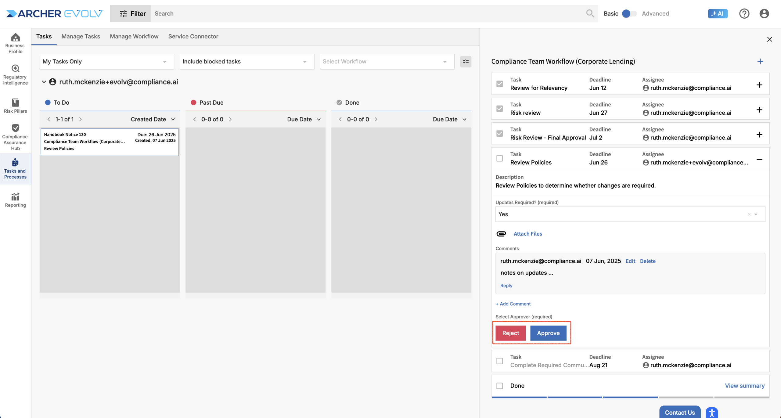 If you are the approver, access the task and choose Reject or Approve. You can add comments to explain your decision. This might be helpful if you choose to Reject the task, which will reassign it to the original assignee so they can complete required steps. If you Approve the task, it will automatically be marked Done.