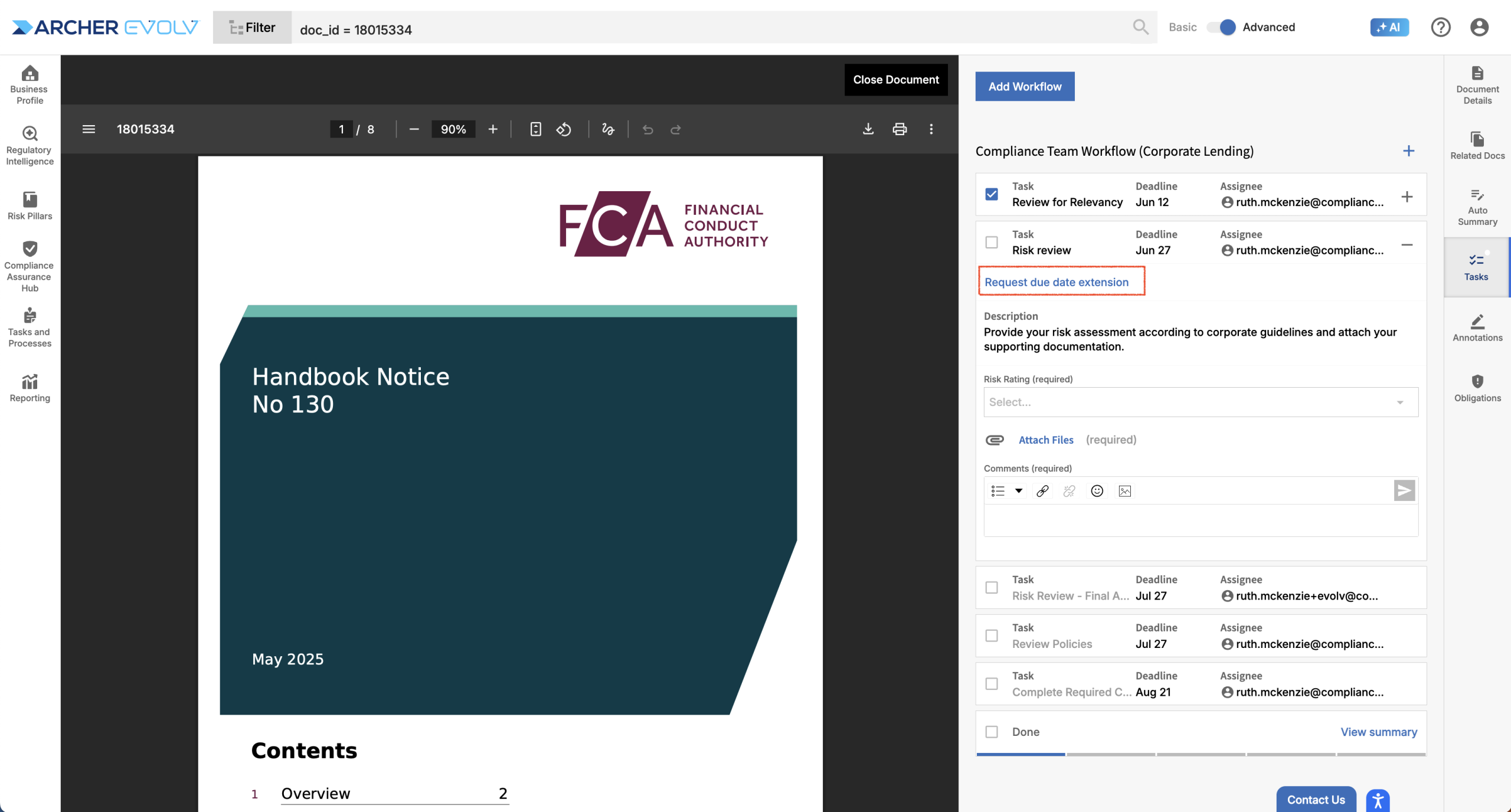 Tasks may also be set up to enable you to request a deadline extension. If this is the case and you wish to request a deadline extension, simply select “Request due date extension”. A task will be created for a user who can approve the extension. This individual can either Approve or Reject the request. If they approve the request, your deadline will be updated. If they reject the request, your deadline will remain unchanged and you will see a message indicating that the request has been rejected.