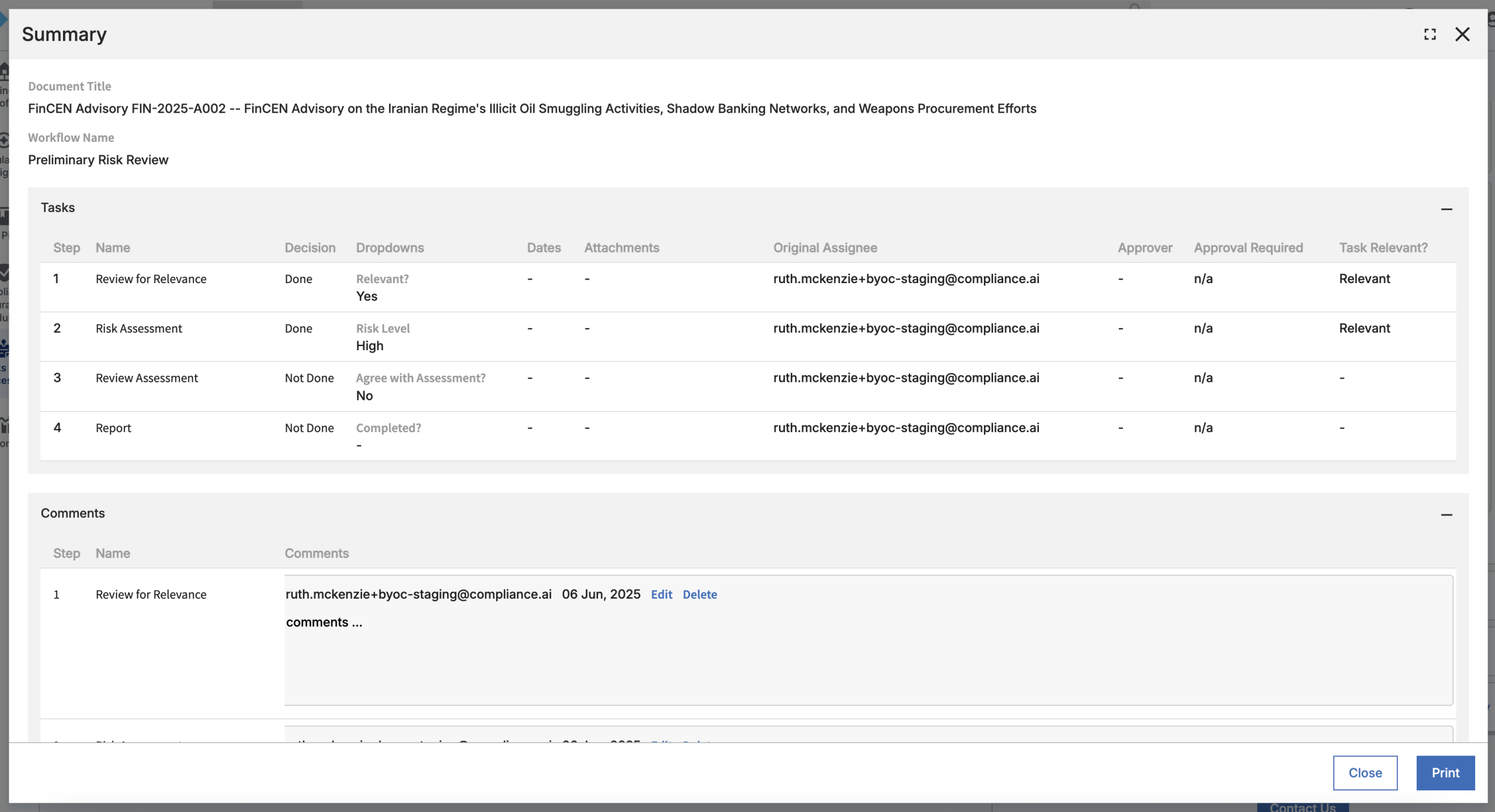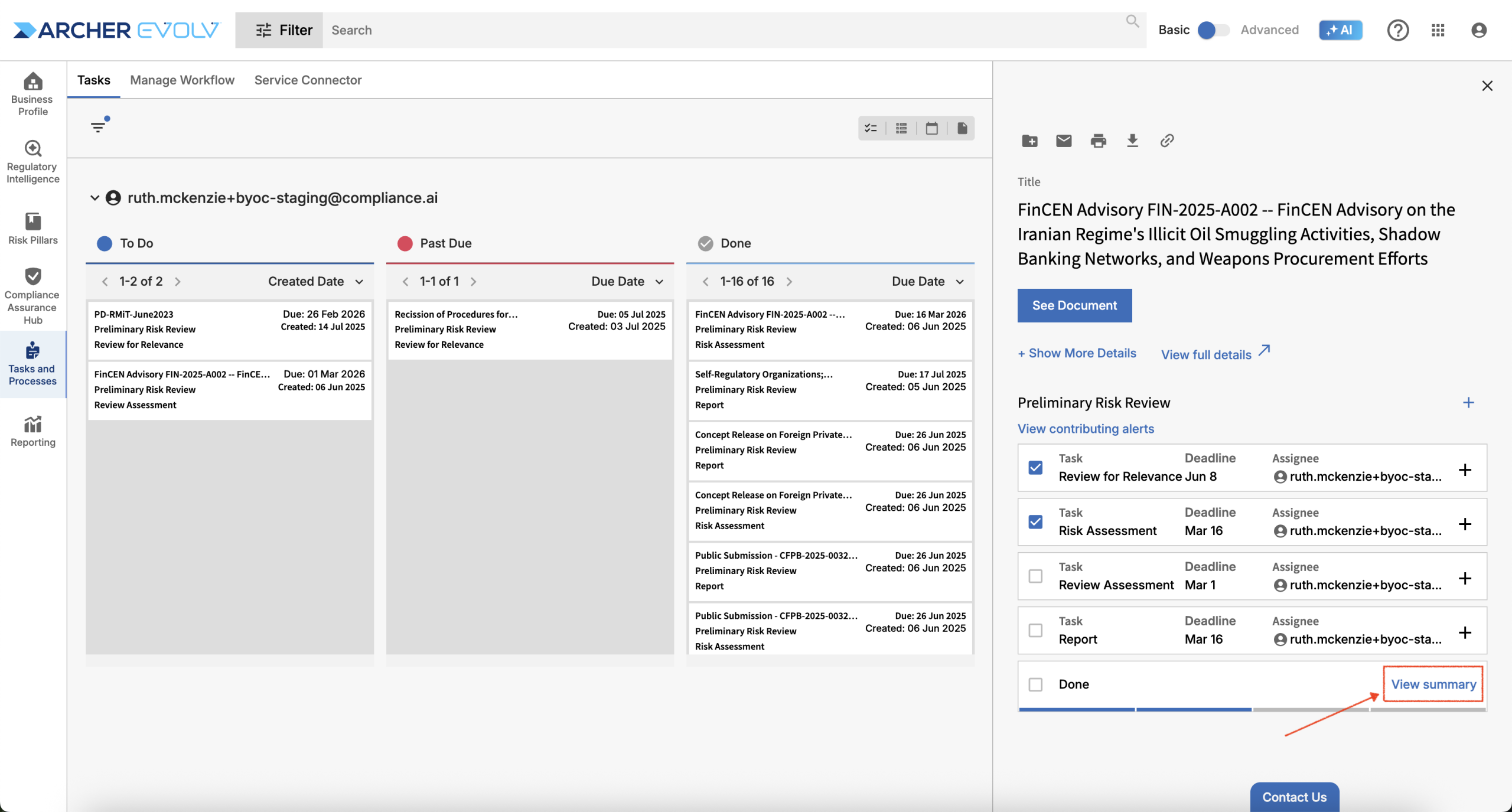 Evolv Compliance also provides a handy summary of your workflow tasks for each document. Click the “View Summary” link found at the bottom of the workflow to open the summary. The summary includes details on all tasks, comments, annotations, and even obligation analysis in an easy to digest format, which you can use as a checklist, or print to PDF and distribute to a larger project team.