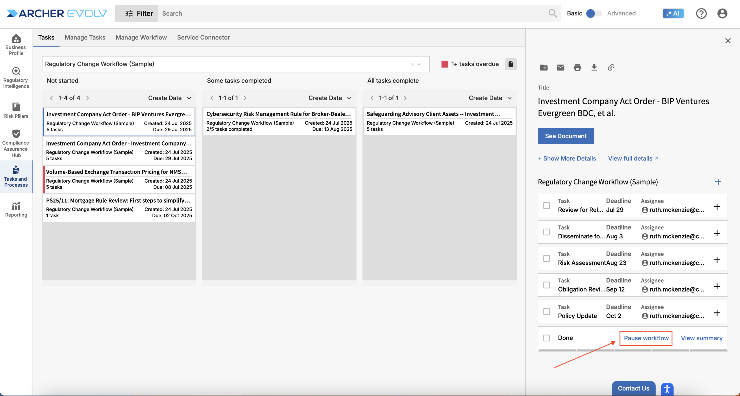 Workflows may be set up to enable certain individuals to pause the workflow. Pausing a workflow freezes tasks in place. Once a workflow is unpaused, task due dates of all tasks that have not yet been completed are updated to reflected the time the workflow was suspended. If you have permission to pause a workflow, you will see a Pause workflow option.