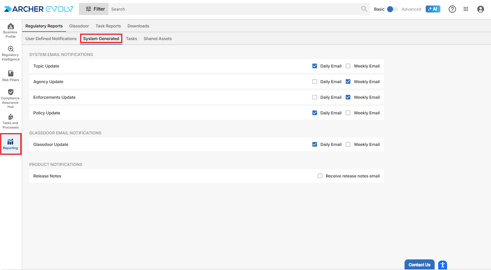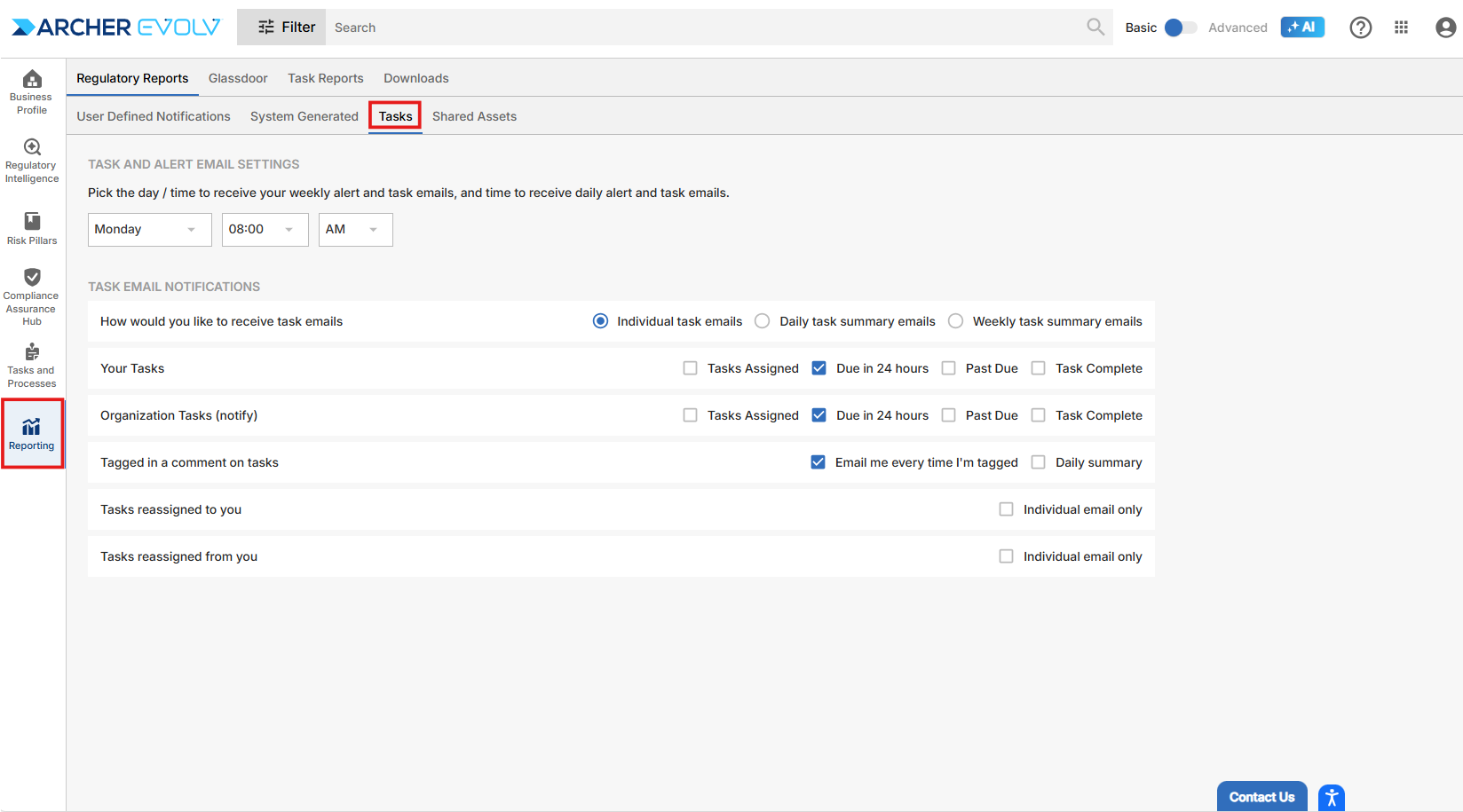 While you are completing your setup, it’s also helpful to check your email notifications and email cadence. To review your email settings, access Reporting > Regulatory Reports and review System Generated, Tasks and Shared Assets.