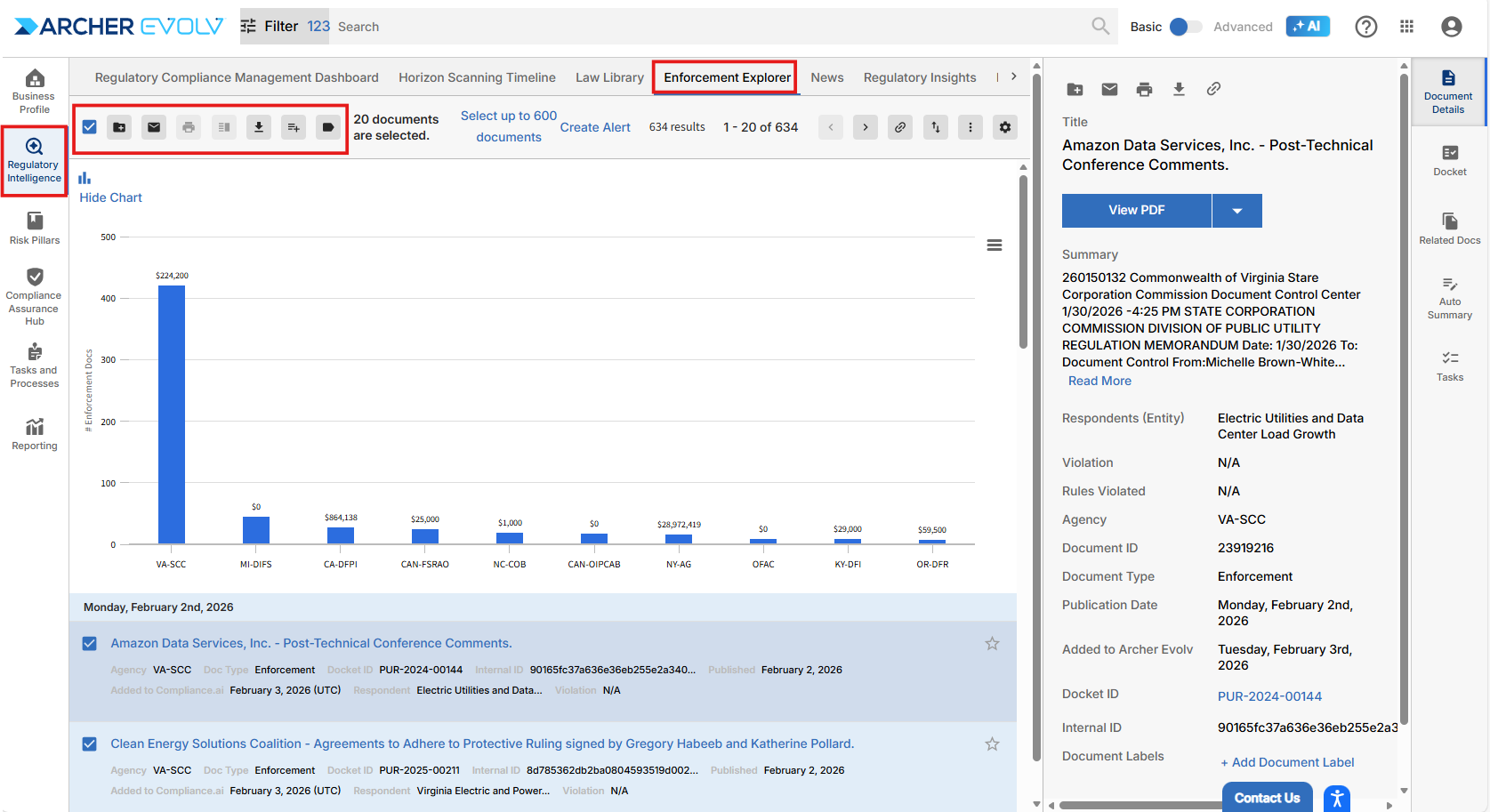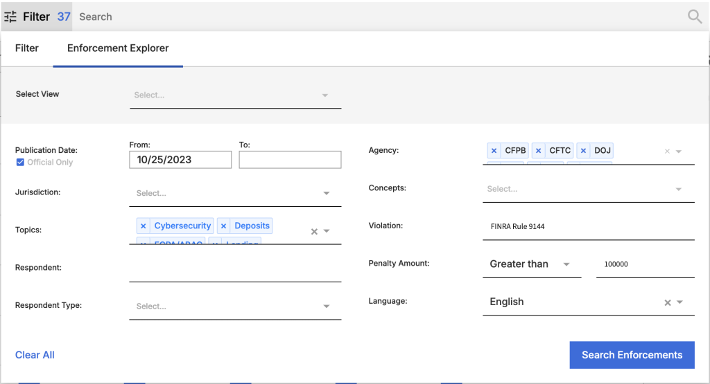 The Enforcement Explorer helps you stay abreast of enforcement documents issued by your default agencies. We extract key information from enforcements, including respondents, details on violations, and penalties, so that you can understand what’s occurring with your peer group without having to drill into each document. The enforcement graph also gives you a handy overview of the most active agencies over the previous months.