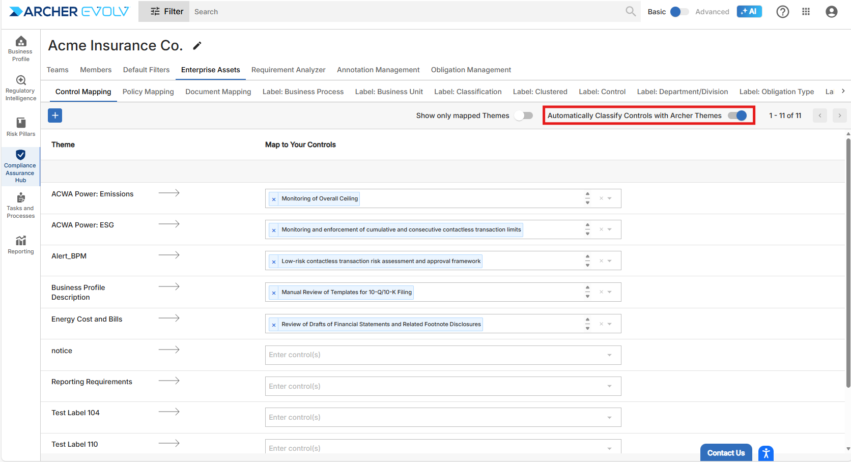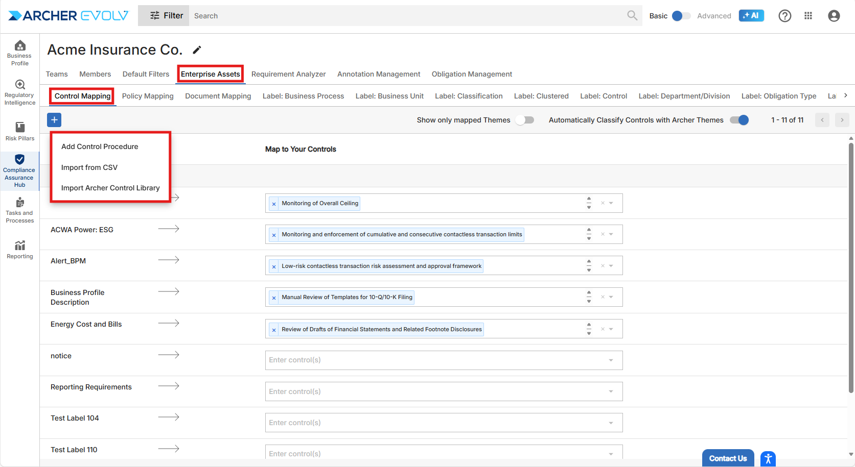 Archer Evolv not only provides you with the capability to monitor and respond to regulatory changes, identify, assess and monitor regulatory and operation risks and establish controls where none exist, we also provide additional capabilities that automate the classification of policies, controls, and regulatory documents. Enterprise Assets, which is available within the Business Profile AI Assistant and also within the Compliance Assurance Hub provides the infrastructure necessary to automate what is otherwise a manual and time-consuming process.