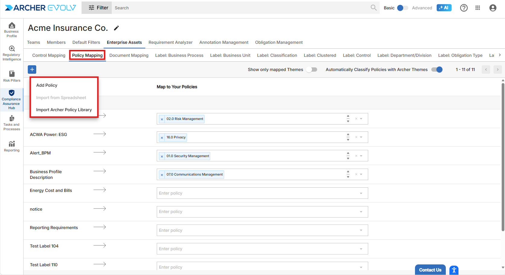 Once policies or controls are available, you can map them based on thematic focus areas. A large number of thematic focus areas are shipped with Archer Evolv out of the box, but you can also add your own unique thematic focus areas by importing theme type labels.