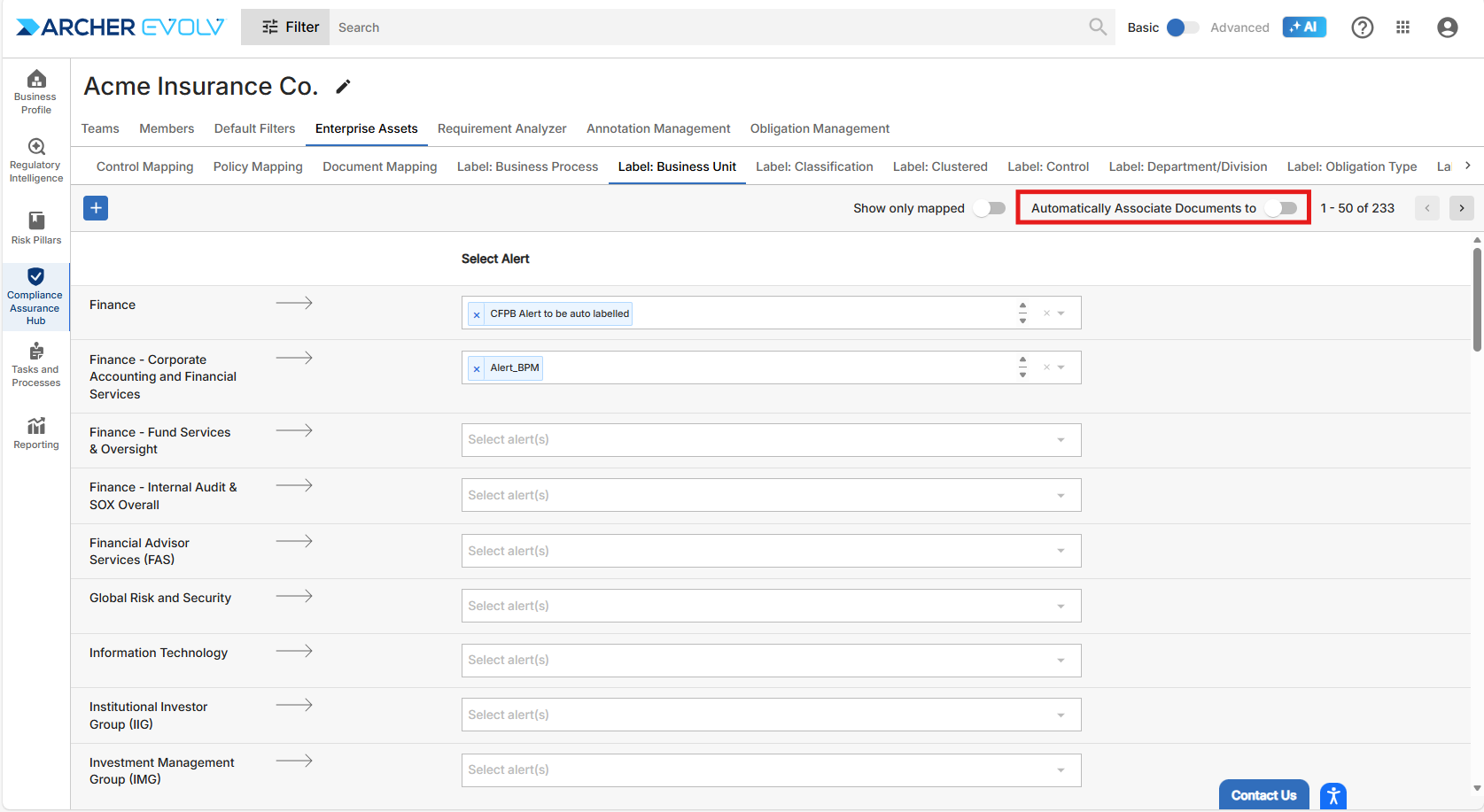 The third Enterprise Asset, Business Unit Mapping, enables you to associate business units to alerts, underpinning automatic dispatch of incoming regulatory change documents to your business units. Simply add business unit type labels based on your organization’s configuration, then associate alert(s) covering relevant topics and you can inform your business units about the most pertinent regulatory changes.