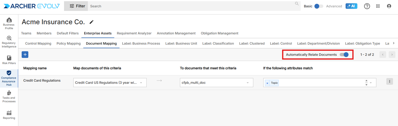 The sixth Enterprise Asset, Document Mapping, relates documents to each other based on common attributes. Document Mapping accomplishes two purposes. First, it can help you see important connections between your documents, such as policies, and regulatory change documents. Second, it can automatically link documents as related documents, helping you analyze related documents in context.