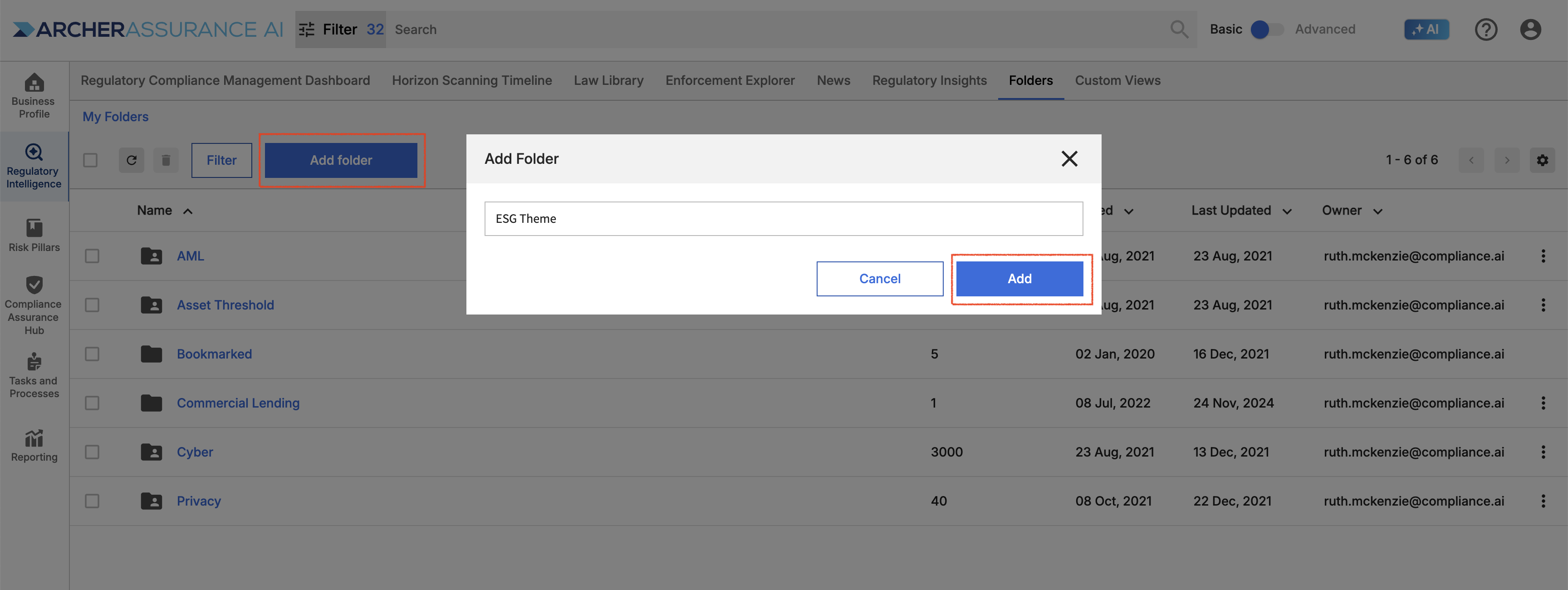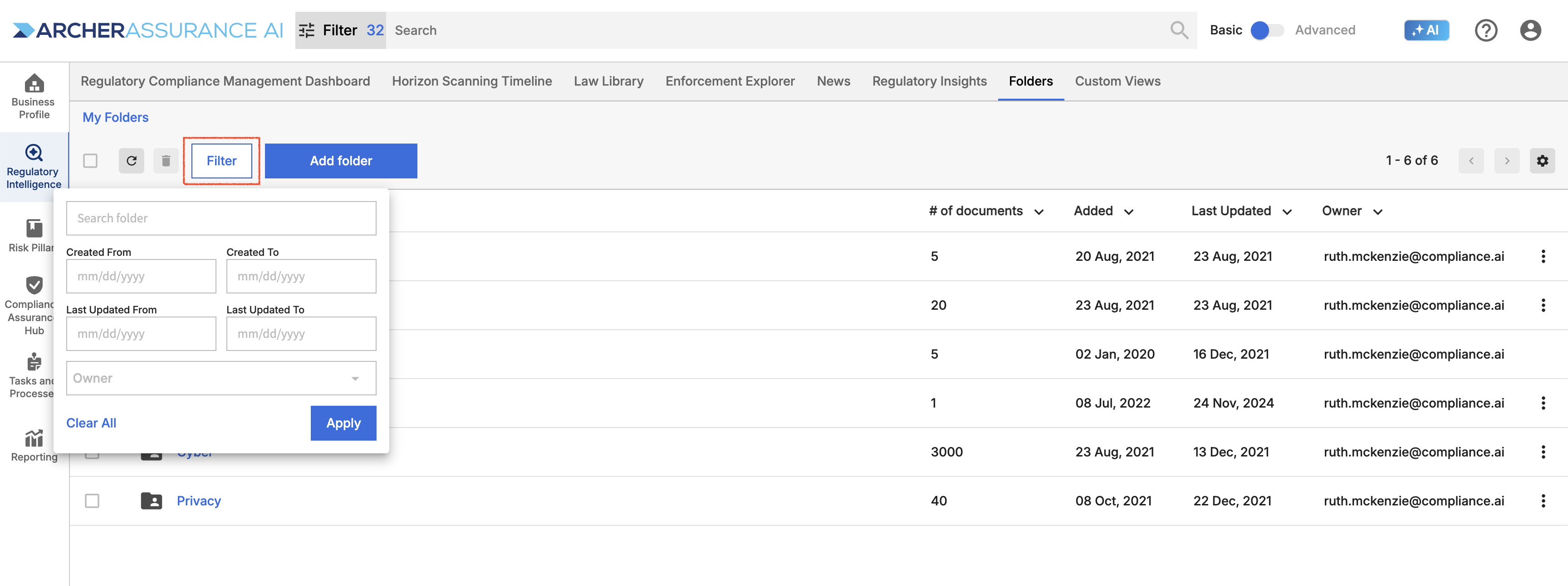 To access your folders, click on Regulatory Intelligence and select Folders. The Folders page gives you access to high-level information about all the folders you’ve created as well as folders your colleagues have shared with you. Within the Folders page, you can: