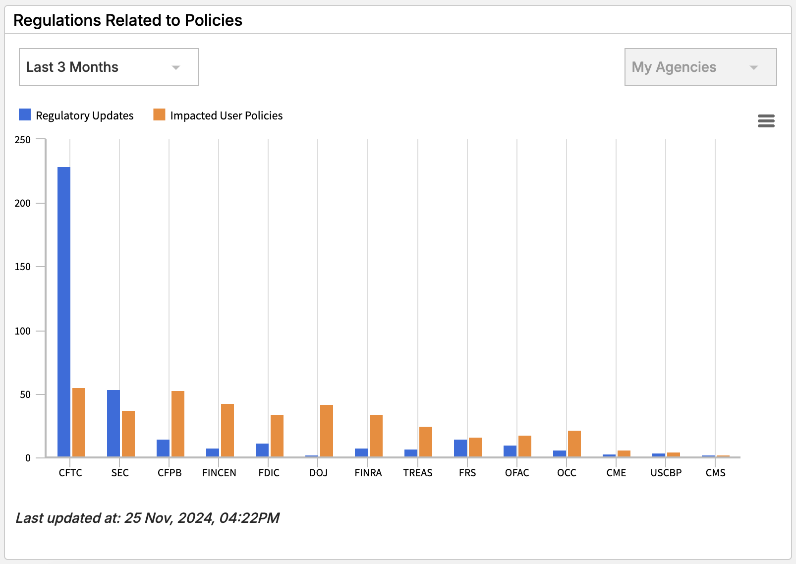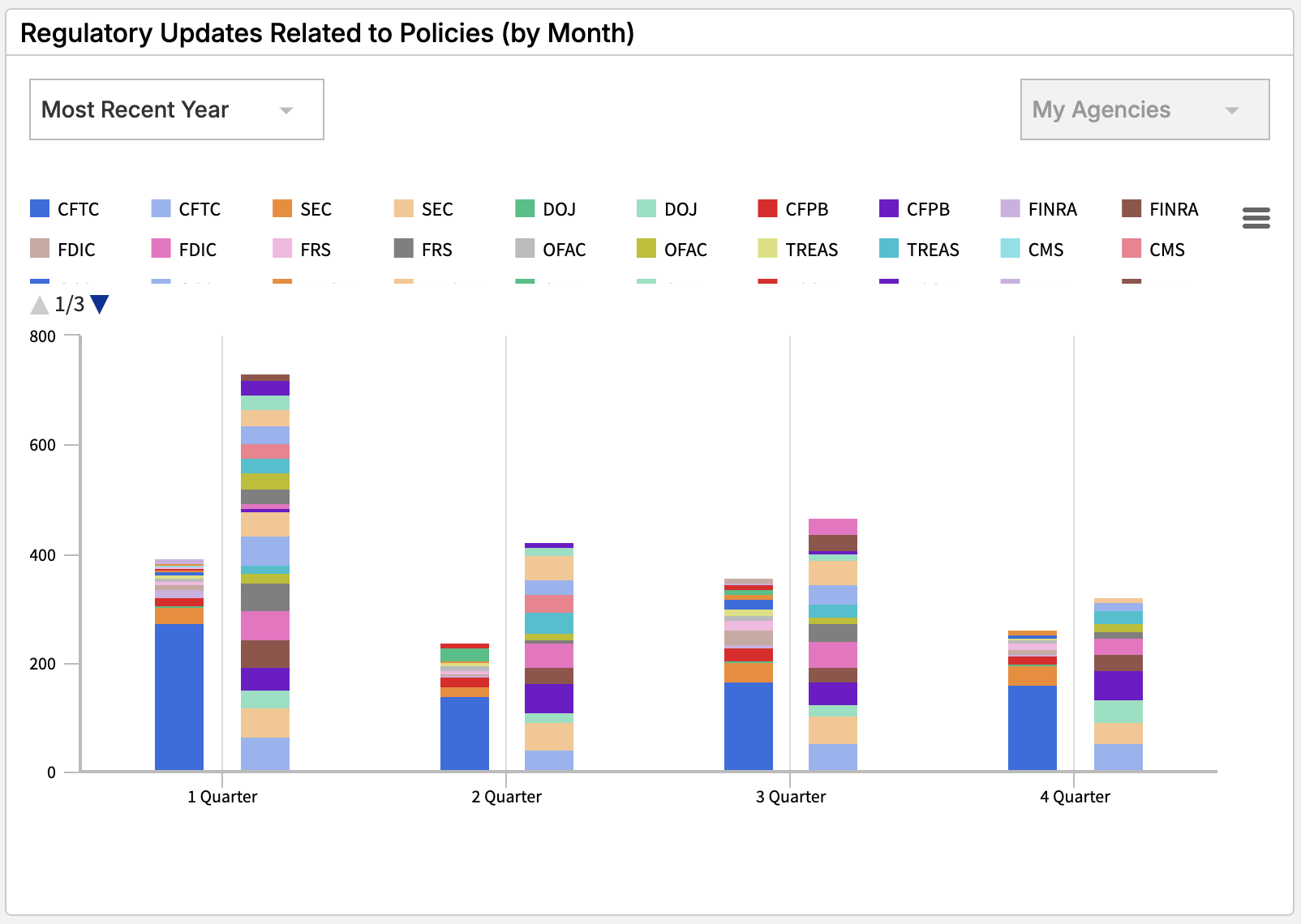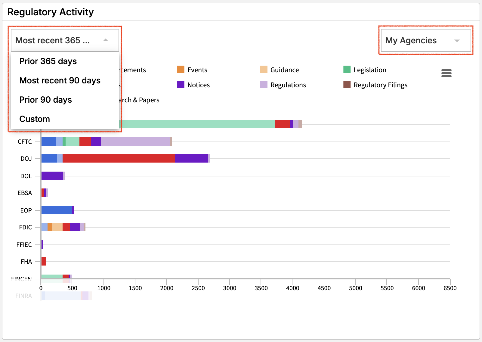 Regulatory Activities: Synthesizes data to help you understand the volume and velocity of key document types published by agencies over multiple time periods.
