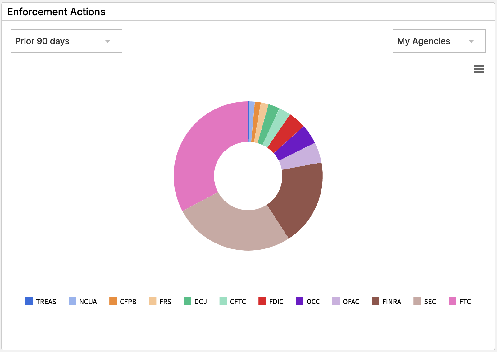 Enforcement Actions: Past 12 Months: Helps you focus on the most active agencies by providing a 12-month snapshot of enforcement documents published by all agencies or just the agencies you follow.