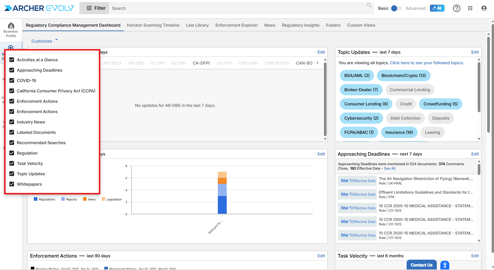 Regulations Updates Related to Policies: If you add your own organization’s policies to Archer Evolv, you can review relationships between your organization’s policies and regulations published by agencies you follow over time. The report is designed to help you identify trends in the pace of regulations related to your policies.