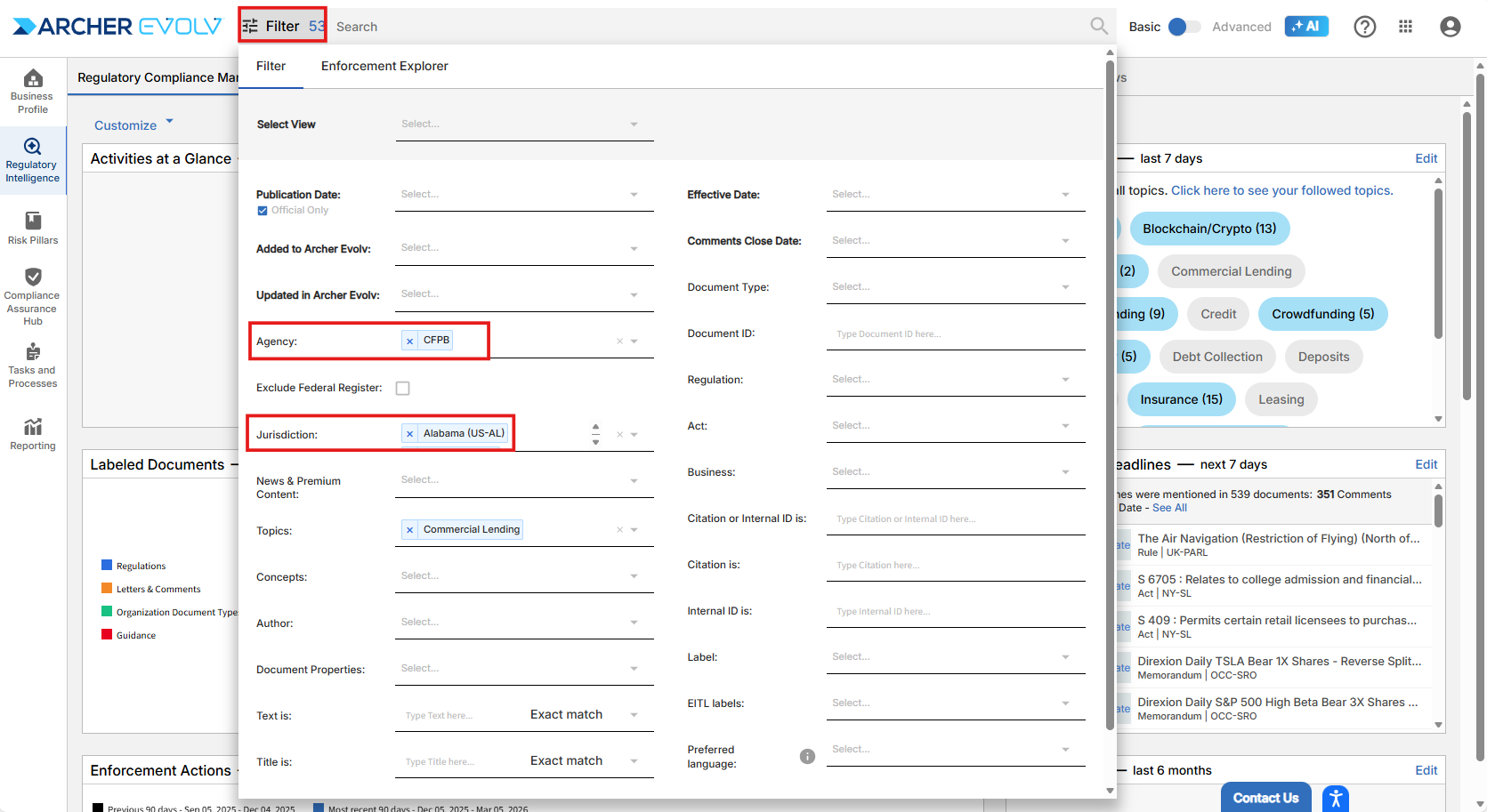 Select Filter in the search bar and enter search criteria using parameters such as Agency, Jurisdiction, Dates, and free text entry fields such as Title and Full Text, then click Search. Remember to save time by selecting a preferred view based on your own personal defaults, the organization’s defaults, or the defaults of a specific team.