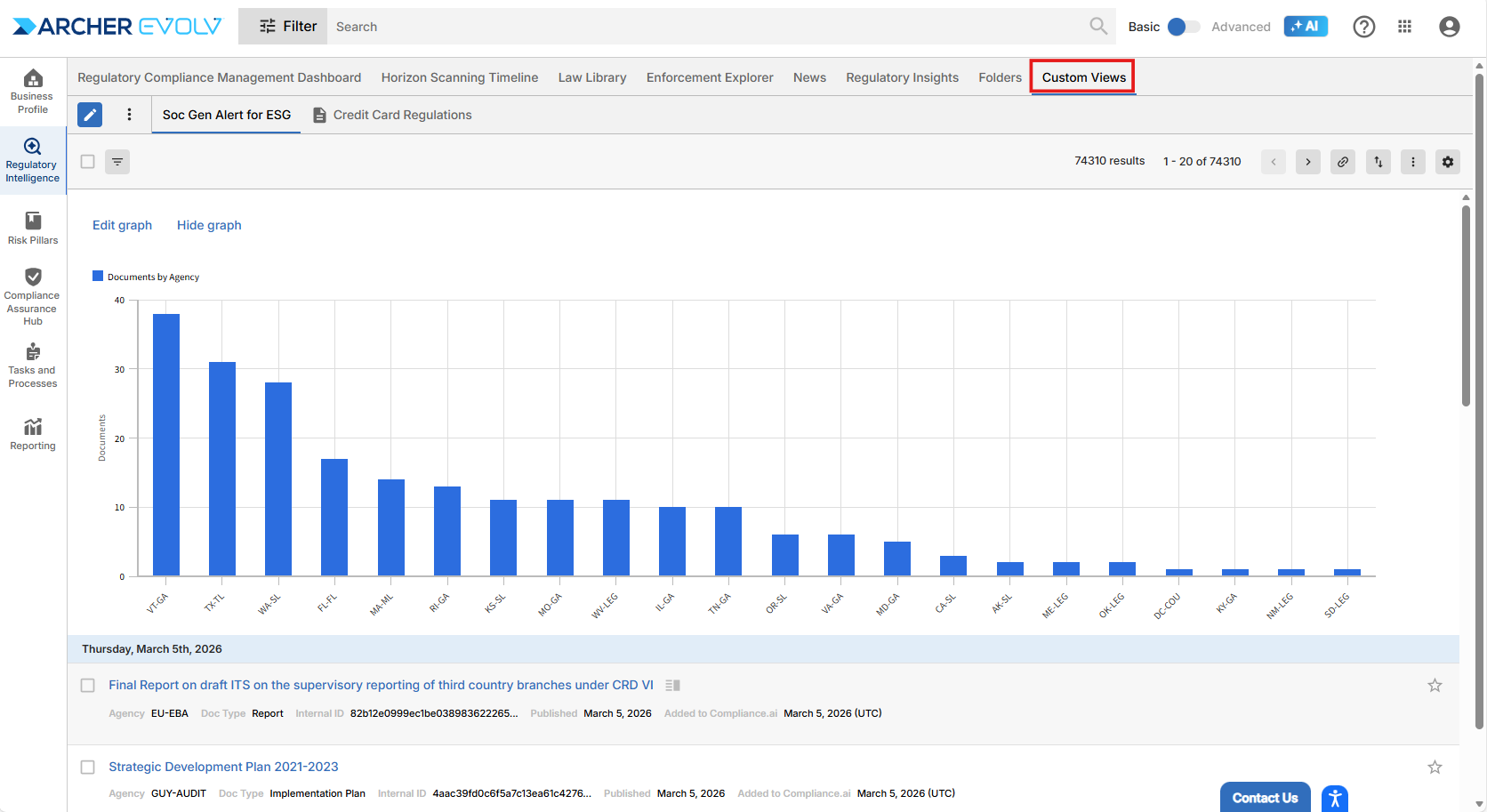 - Add Custom View: You can create your own Custom View within Regulatory Intelligence. If you have alerts you rely on frequently, adding them as custom views makes them easily accessible within Regulatory Intelligence.