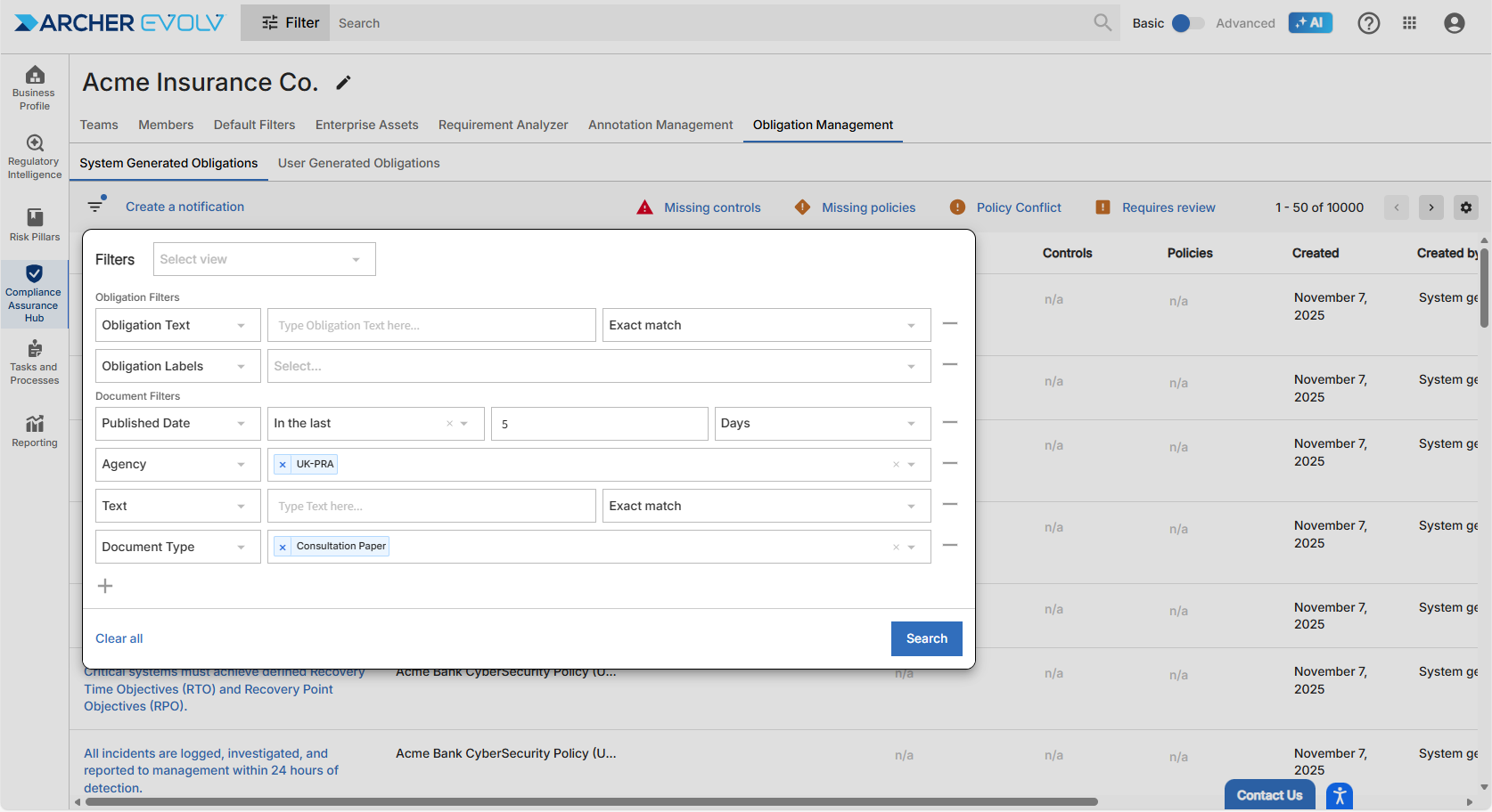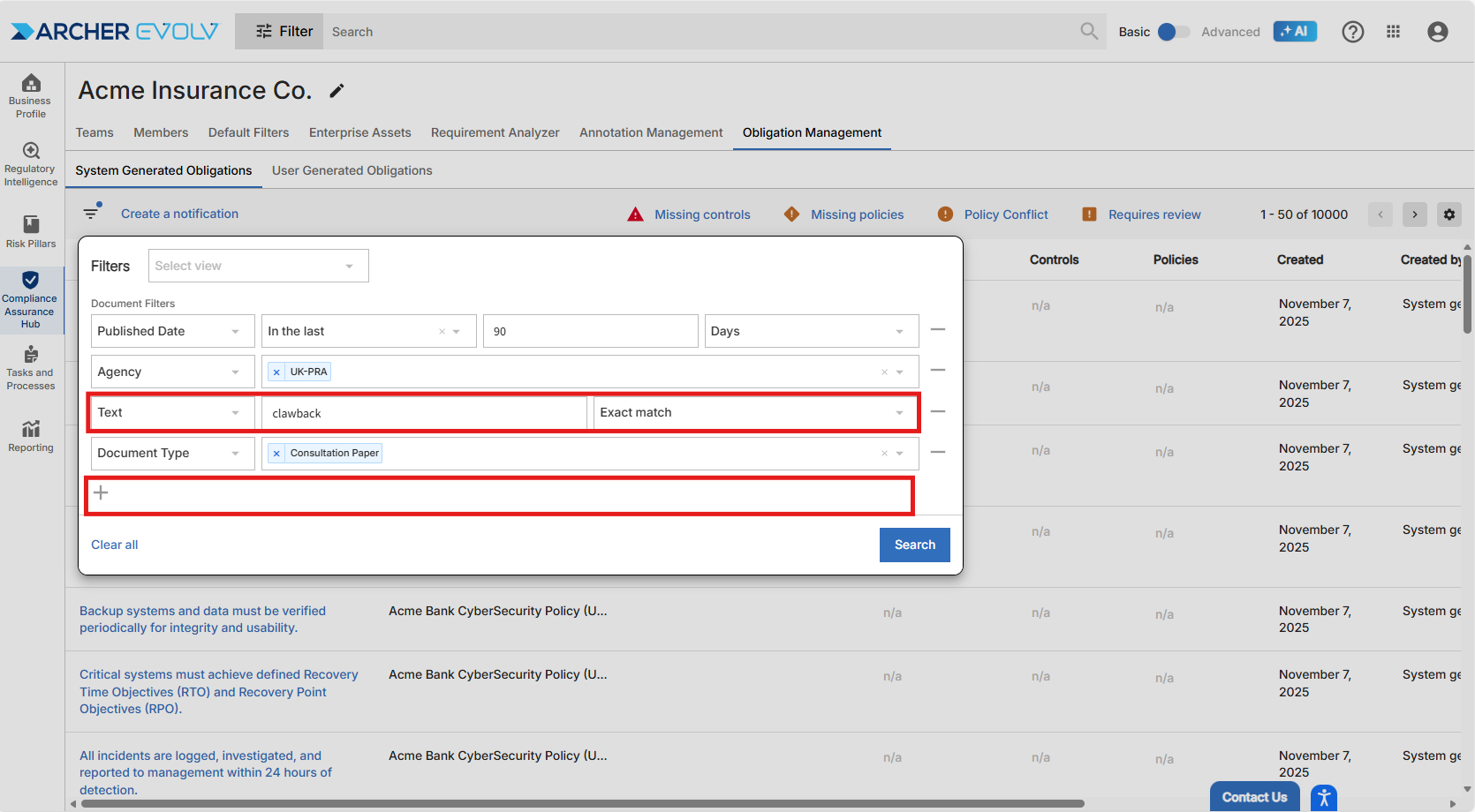 For example, if you are interested in clawbacks, but want to focus only on recently published UK-PRA consultation papers, you can enter obligation text = “clawbacks” and then enter the document relevant document level attributes. This very specific search yields seven obligations that are likely highly relevant to you and your team.