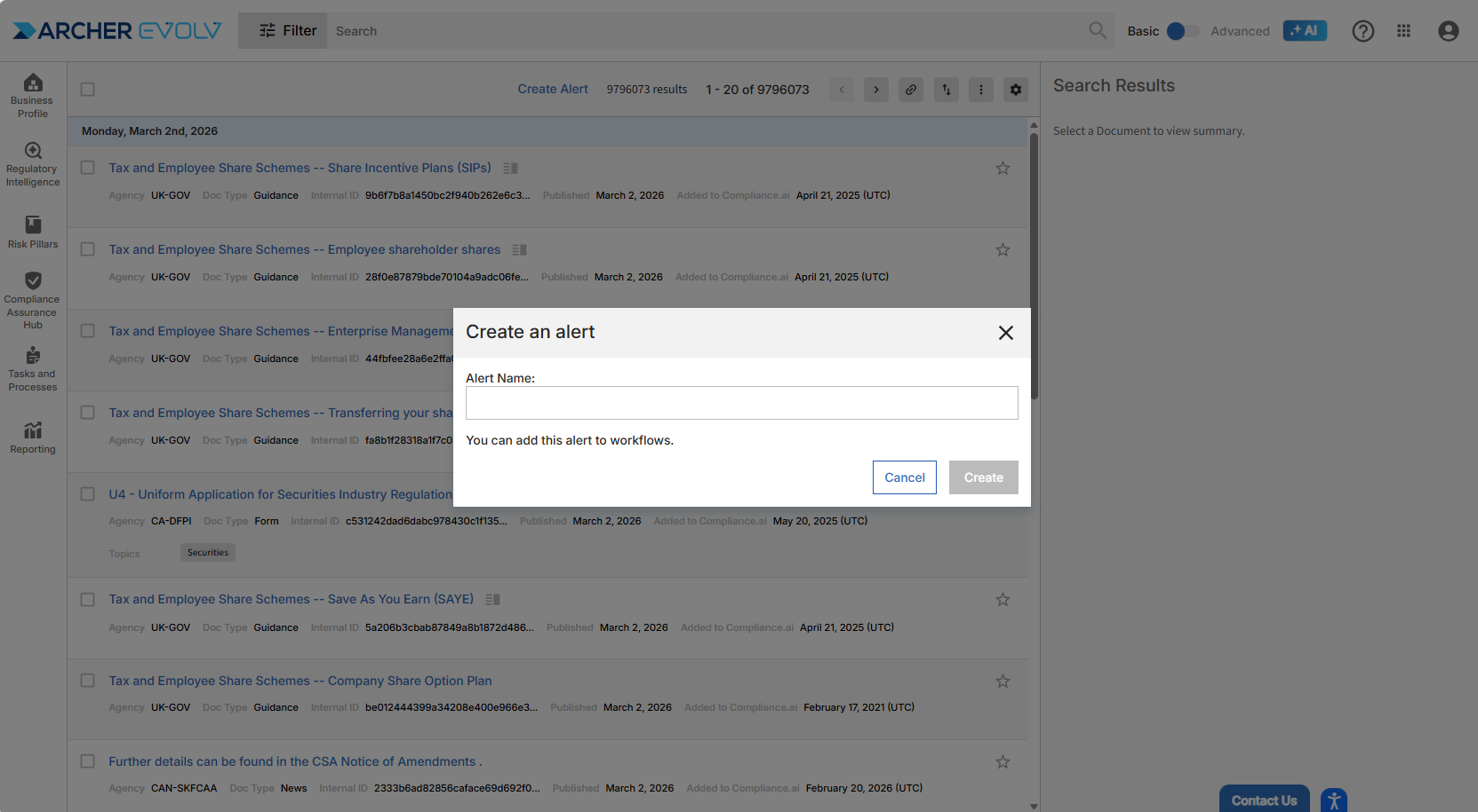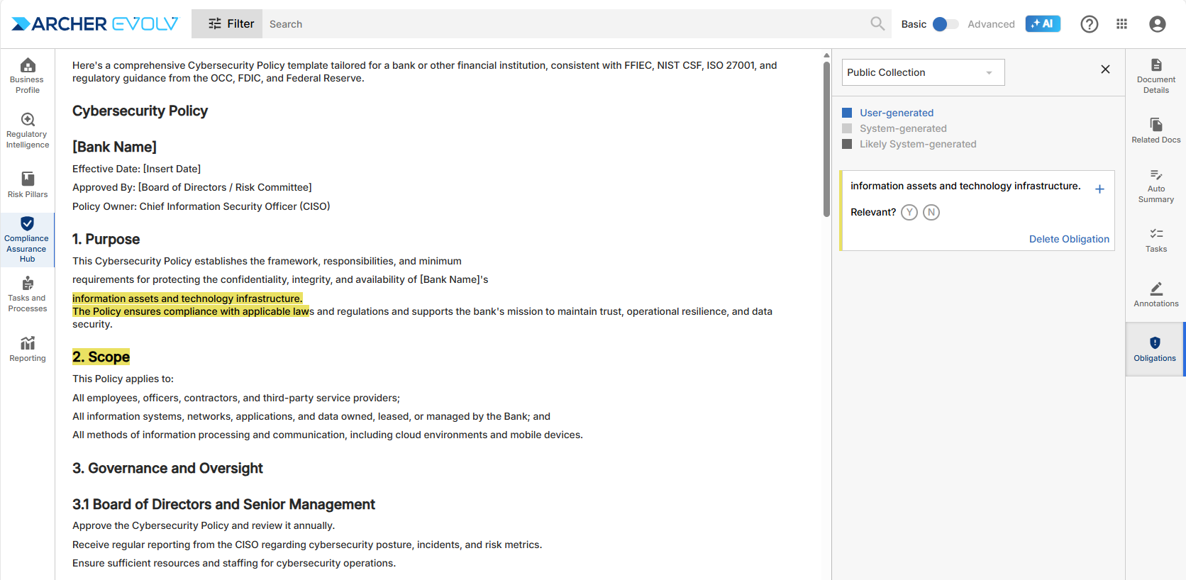 The Obligation Management tool enables Archer Evolv users to search for specific obligatory language found within documents on the platform and act on control and policy concerns.