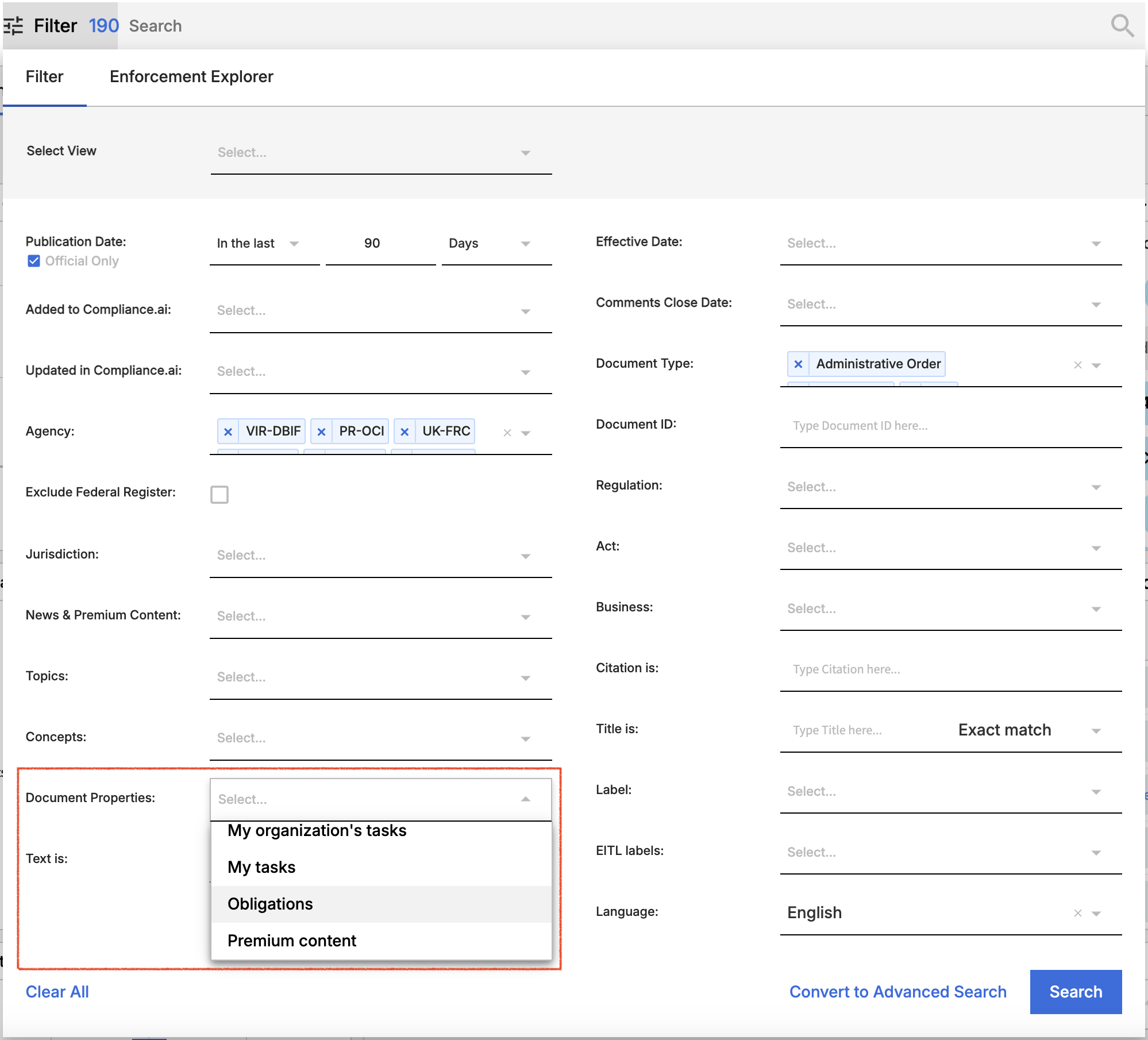 To find documents that include Obligations, select “Document Properties = Obligations” within Search Filters.