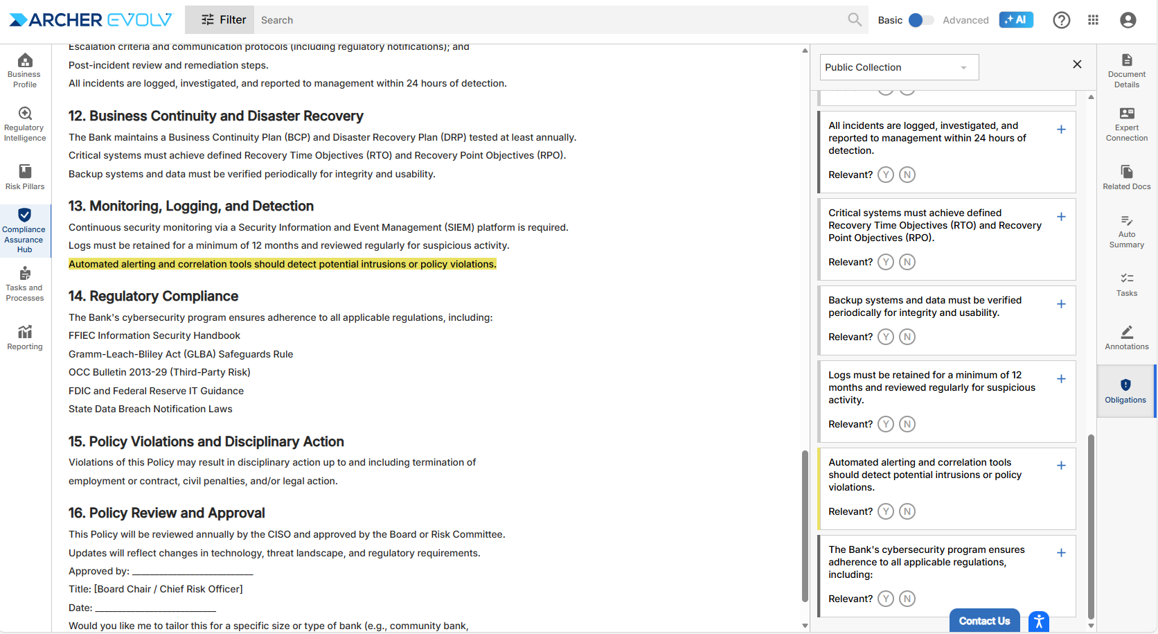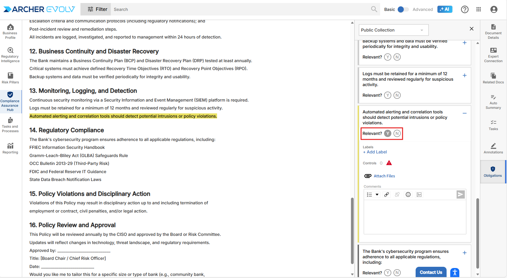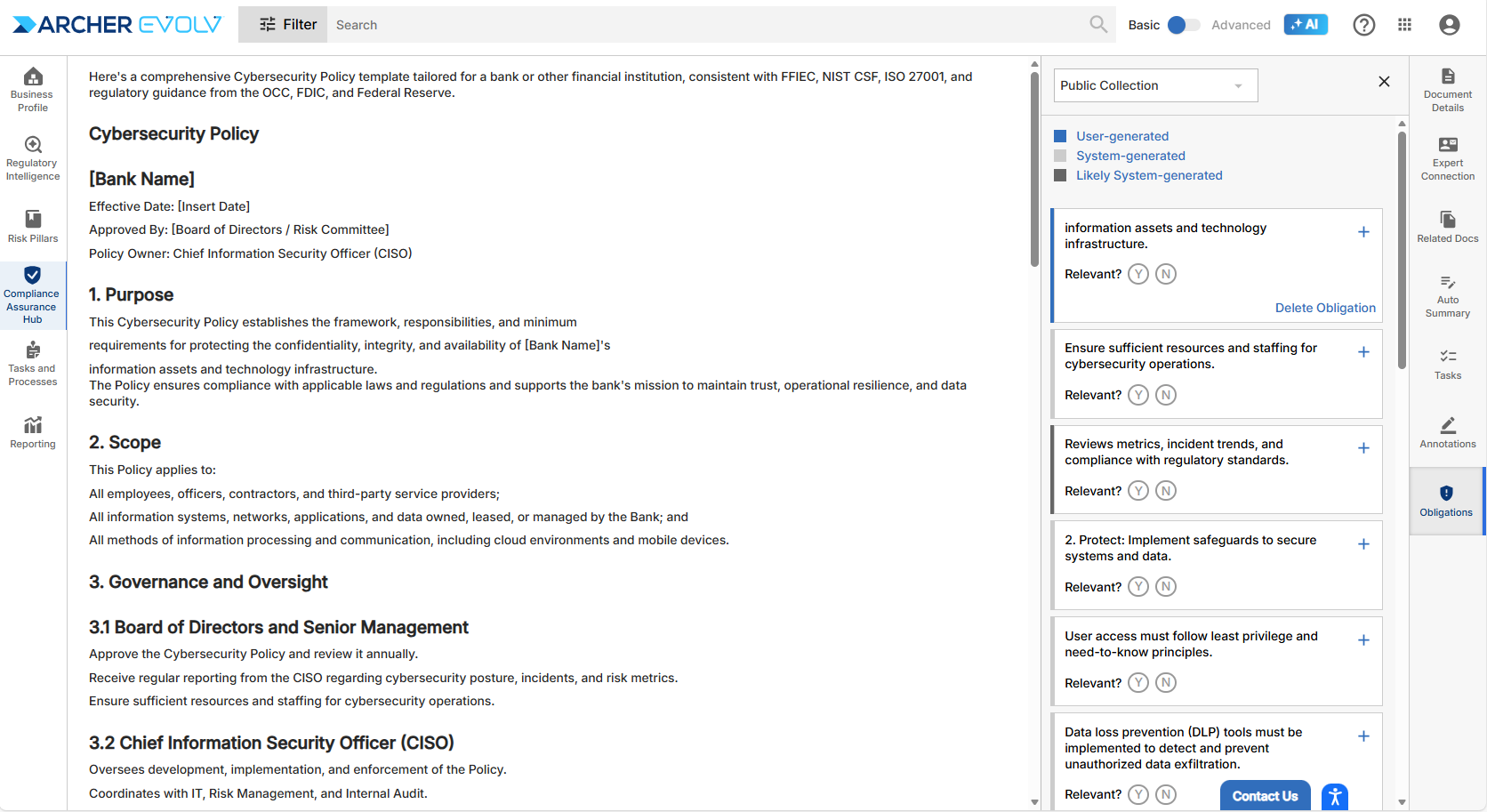 You can access and review content categorized as Obligations. These Obligations are either automatically categorized by Archer Evolv (system-generated), or by users in your organization (user-generated). You can review the Obligations to determine if they are relevant to your organization, add labels to map the Obligations to your controls, annotate them using a rich text editor, and add links or attachments.