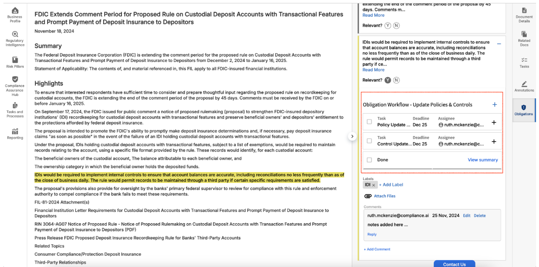 Once you’ve selected an Obligation, you can mark it as relevant or not relevant to your organization and add annotations such as labels, attachments and comments that will provide context for you and your colleagues. Note that all enrichments and all user-generated obligations are specific to your organization only.