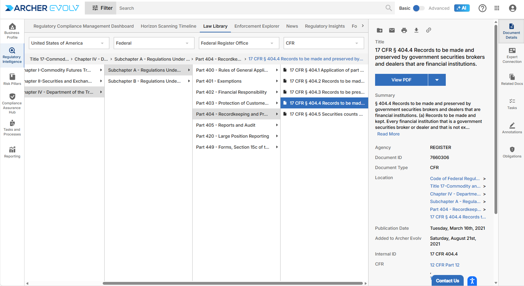 Within the Law Library, you’ll find the same array of document functionality including Document Details, Versions (when applicable), Expert Connections, Related Documents, Tasks, Annotations and Obligations as you would on documents found within the Timeline or any other search view.