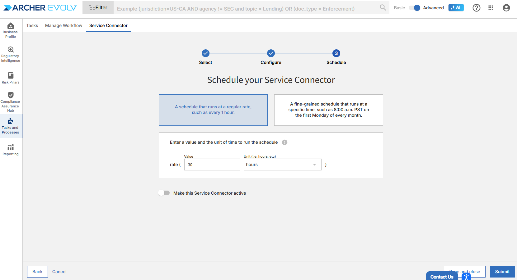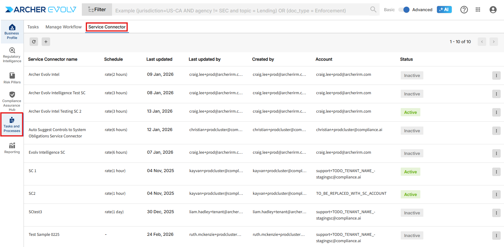 Service connectors are specialized bot tasks designed to perform critical work such as sending documents and data to your GRC and automatically labeling documents within Archer Evolv.