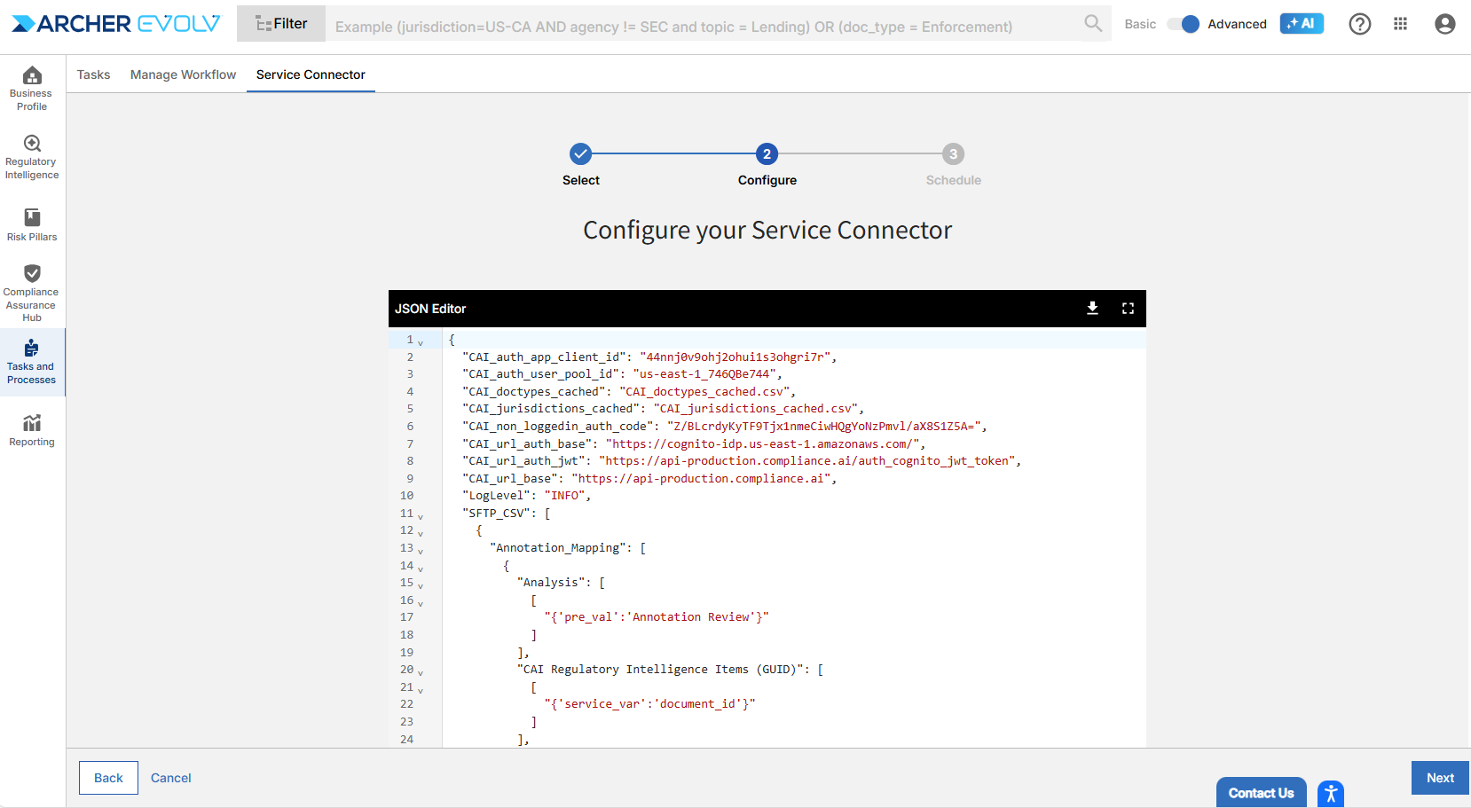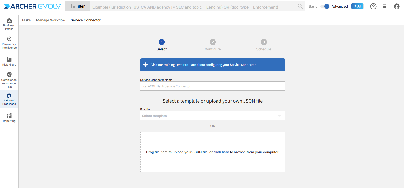 If you are a service connector client, contact support@compliance.ai to gain access to this feature so you can configure your own service connectors. Once we’ve enabled access, you can start the process by selecting Tasks and Processes > Service Connector.