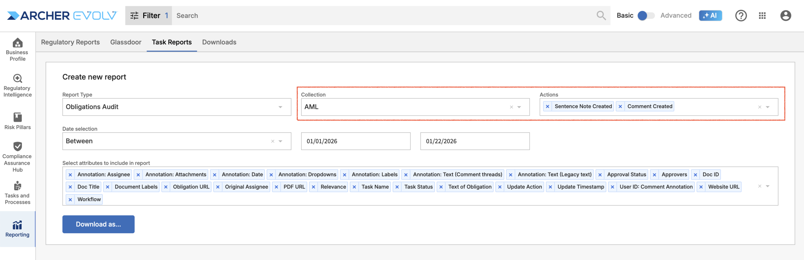 • Task Reports > Obligation Audit: Added filtering by Collection and Action to enable you to generate more tailored reports related to comments, labels, and other actions taken regarding obligations.