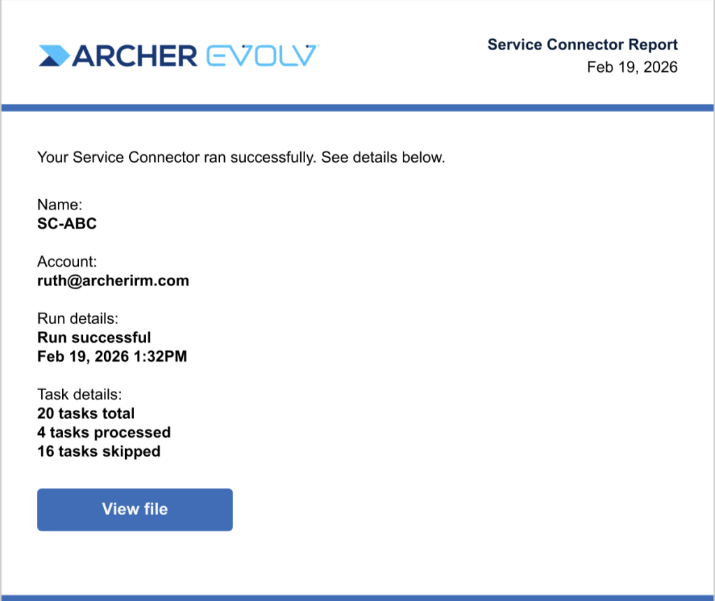 • Service Connectors: If you leverage service connectors for key processes, sign up for the new service connector email. The email provides a summary of tasks processed by the service connector and indicates whether a specific service connector run has been successful. Enroll to receive the service connector email for any service connectors you want to monitor on an ongoing, run by run basis by accessing Tasks & Processes > Service Connector and selecting “Turn on email alerts”.